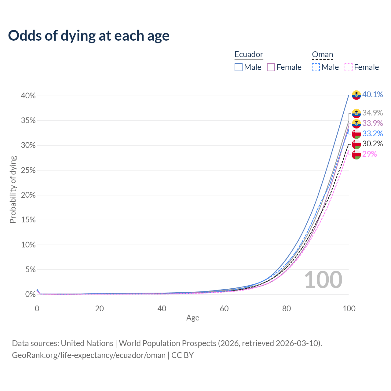 This life expectancy calculator shows the odds of living to 100, 95, 90, and below based on current age for both males and females in Ecuador and Oman, along with mean and median age of death. The calculations are based on the 2026 life tables (actuarial tables) from the UN World Population Prospects.