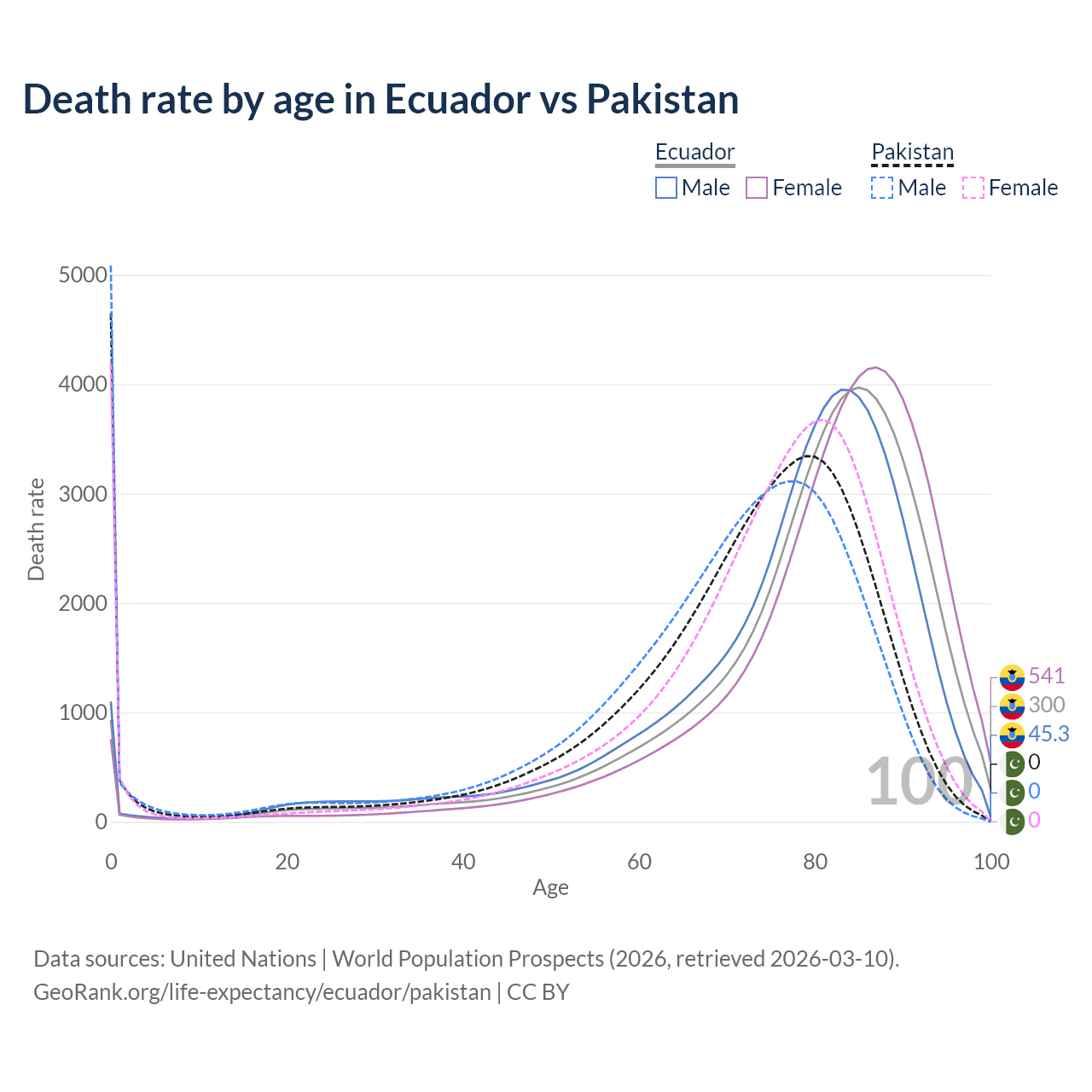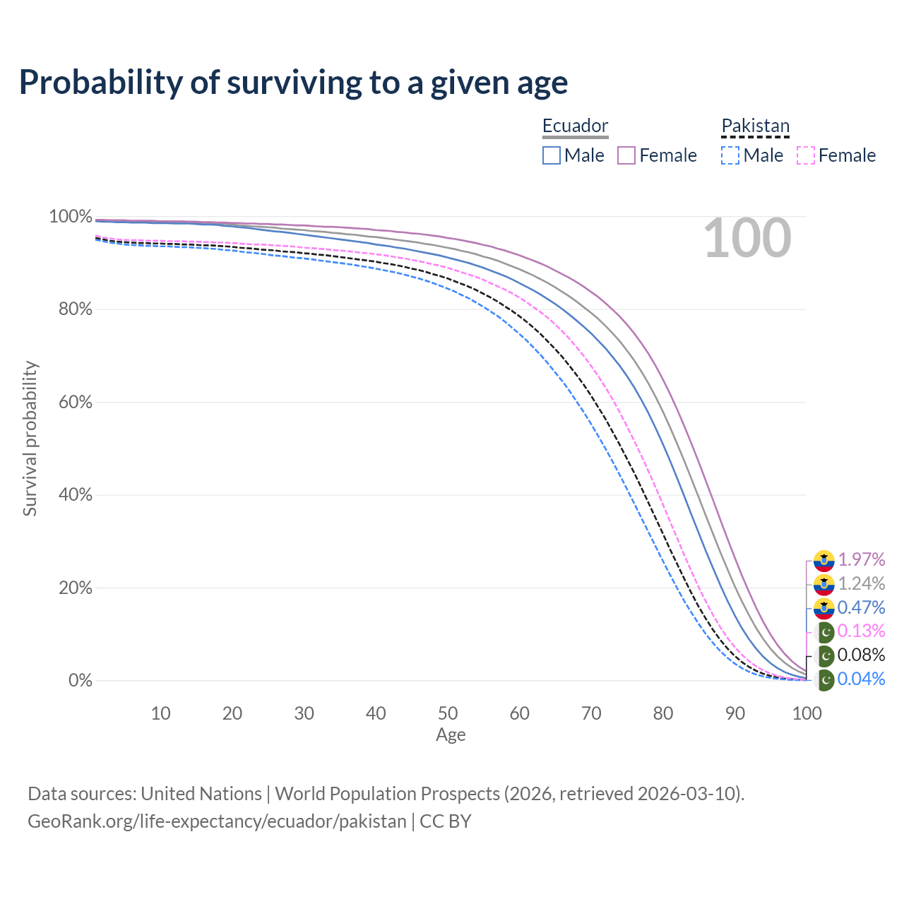 This life expectancy calculator shows the odds of living to 100, 95, 90, and below based on current age for both males and females in Ecuador and Pakistan, along with mean and median age of death. The calculations are based on the 2026 life tables (actuarial tables) from the UN World Population Prospects.