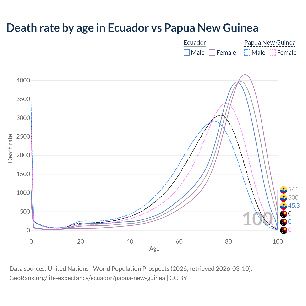 In Ecuador, the most common age of death is 85, compared to 0 in Papua New Guinea. The median age of death is 82.3 in Ecuador and 71.7 in Papua New Guinea, meaning only half of each cohort is expected to live past that age.