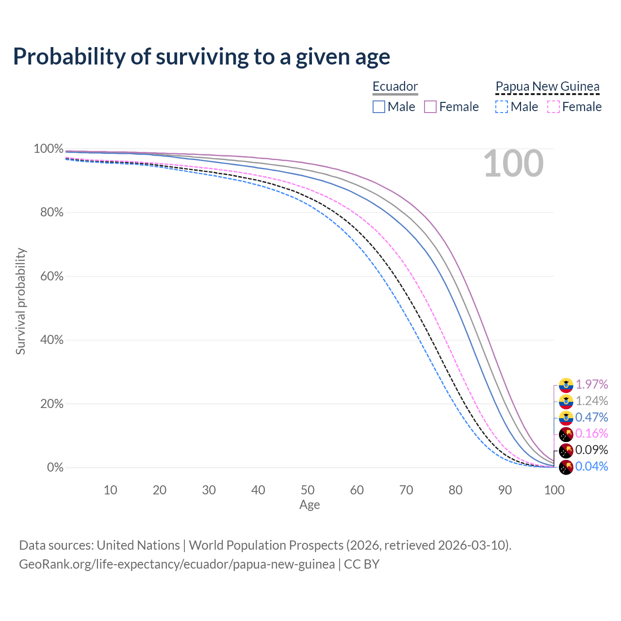 This life expectancy calculator shows the odds of living to 100, 95, 90, and below based on current age for both males and females in Ecuador and Papua New Guinea, along with mean and median age of death. The calculations are based on the 2026 life tables (actuarial tables) from the UN World Population Prospects.