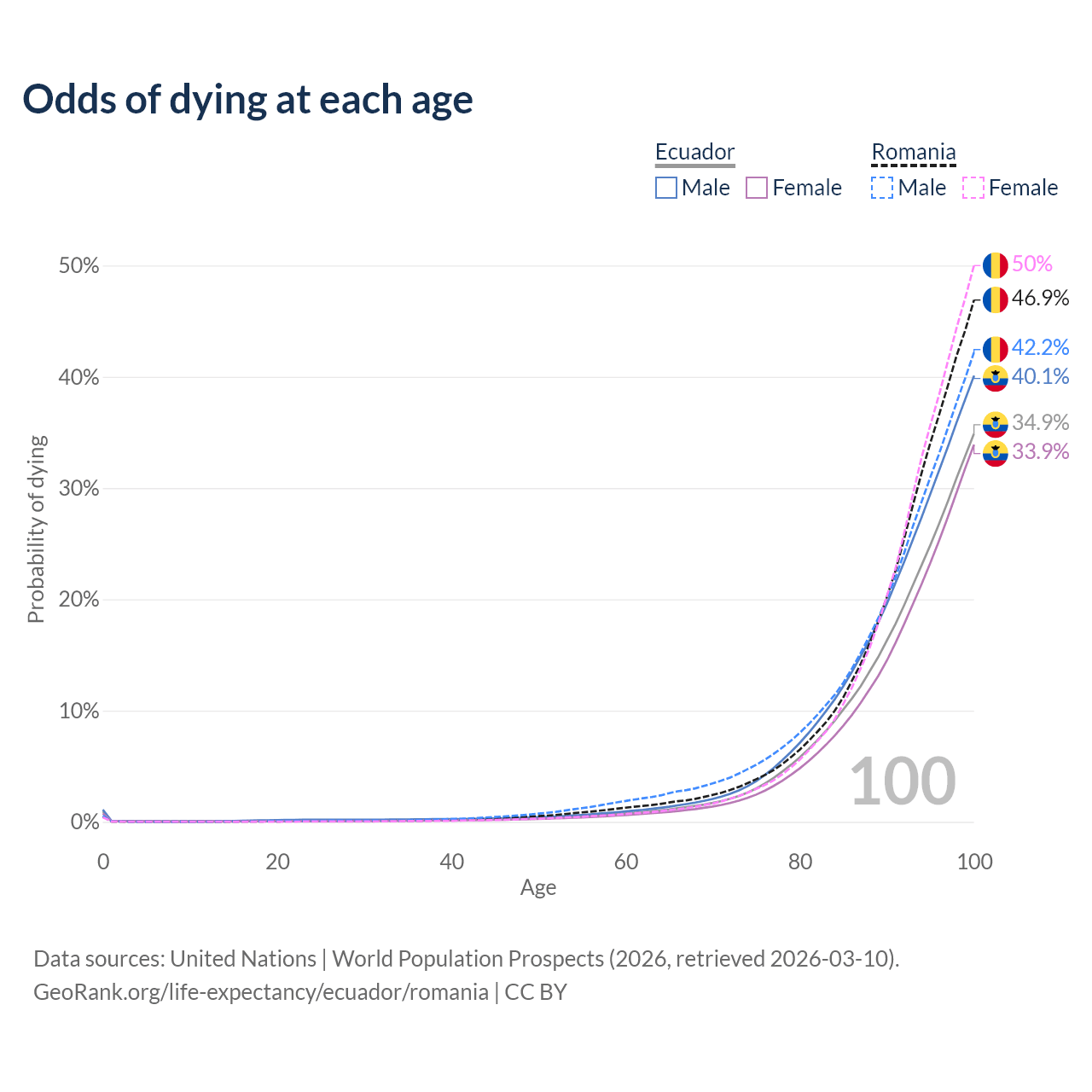 This life expectancy calculator shows the odds of living to 100, 95, 90, and below based on current age for both males and females in Ecuador and Romania, along with mean and median age of death. The calculations are based on the 2026 life tables (actuarial tables) from the UN World Population Prospects.
