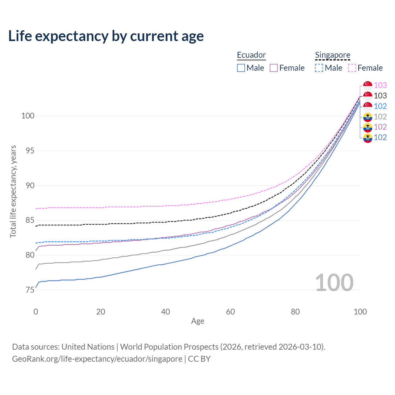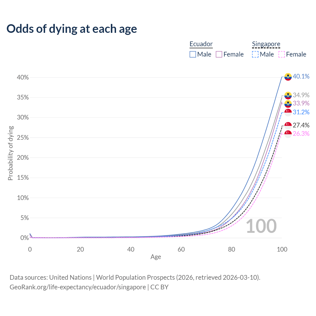 This life expectancy calculator shows the odds of living to 100, 95, 90, and below based on current age for both males and females in Ecuador and Singapore, along with mean and median age of death. The calculations are based on the 2026 life tables (actuarial tables) from the UN World Population Prospects.