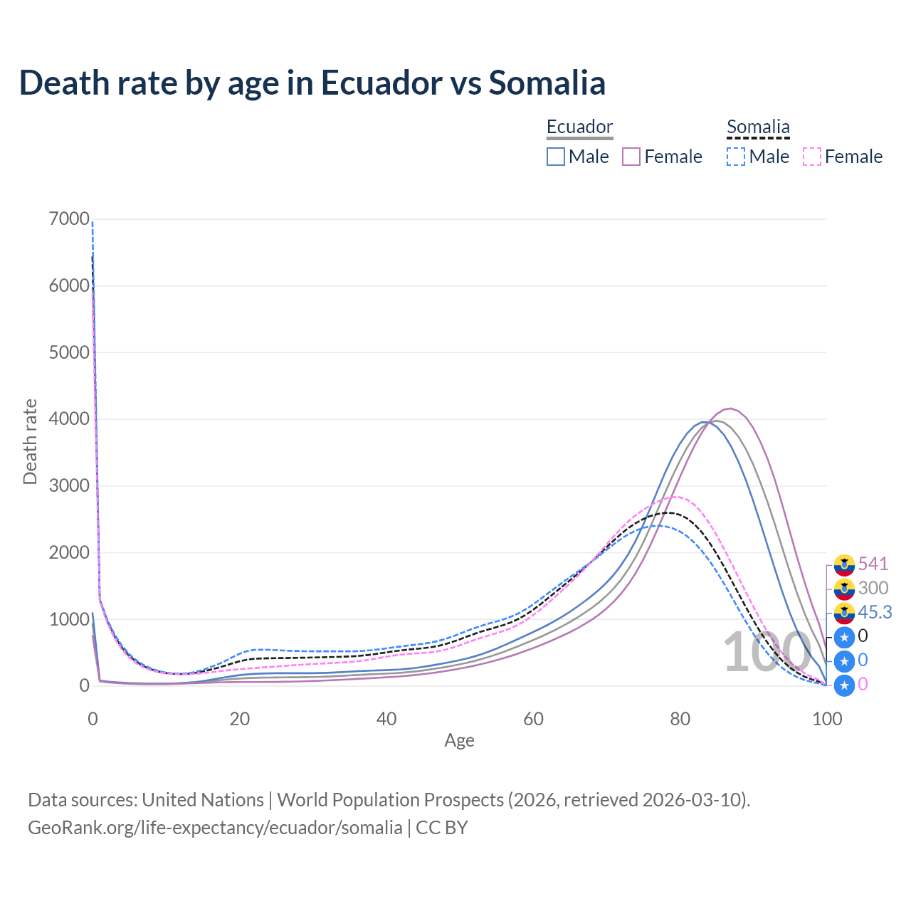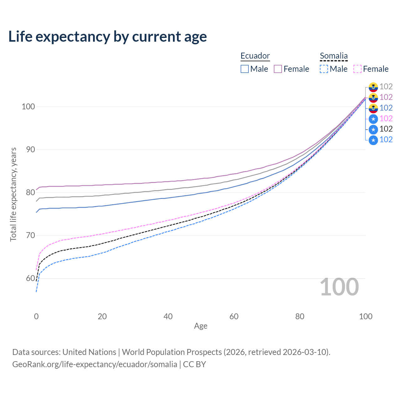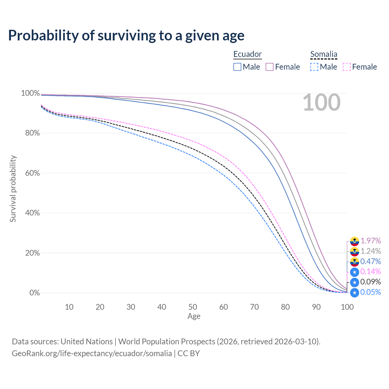 This life expectancy calculator shows the odds of living to 100, 95, 90, and below based on current age for both males and females in Ecuador and Somalia, along with mean and median age of death. The calculations are based on the 2026 life tables (actuarial tables) from the UN World Population Prospects.