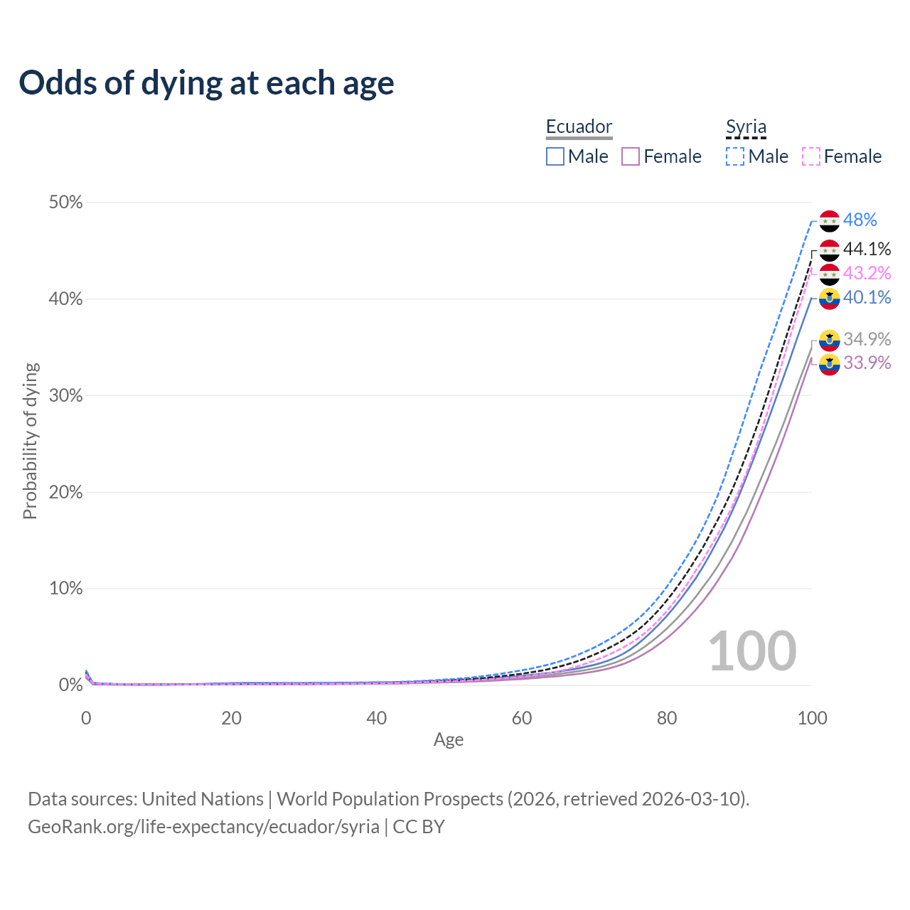 This life expectancy calculator shows the odds of living to 100, 95, 90, and below based on current age for both males and females in Ecuador and Syria, along with mean and median age of death. The calculations are based on the 2026 life tables (actuarial tables) from the UN World Population Prospects.