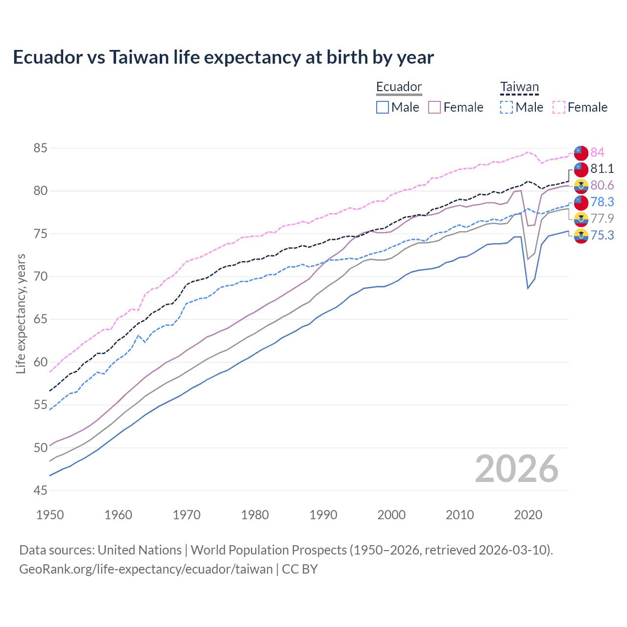 The average life expectancy at birth is 77.9 years in Ecuador vs 81.1 in Taiwan. Ecuador is ranked 65/197 by life expectancy, and Taiwan is 40/197. In Ecuador, the life expectancy is 75.3 years for males and 80.6 years for females. In Taiwan, it's 78.3 years for males and 84 years for females.