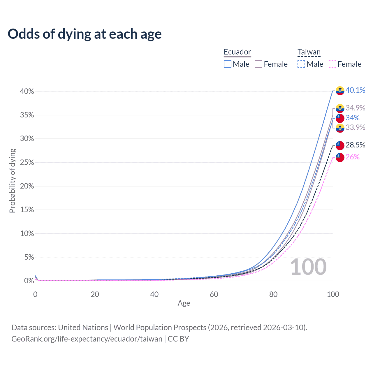 This life expectancy calculator shows the odds of living to 100, 95, 90, and below based on current age for both males and females in Ecuador and Taiwan, along with mean and median age of death. The calculations are based on the 2026 life tables (actuarial tables) from the UN World Population Prospects.