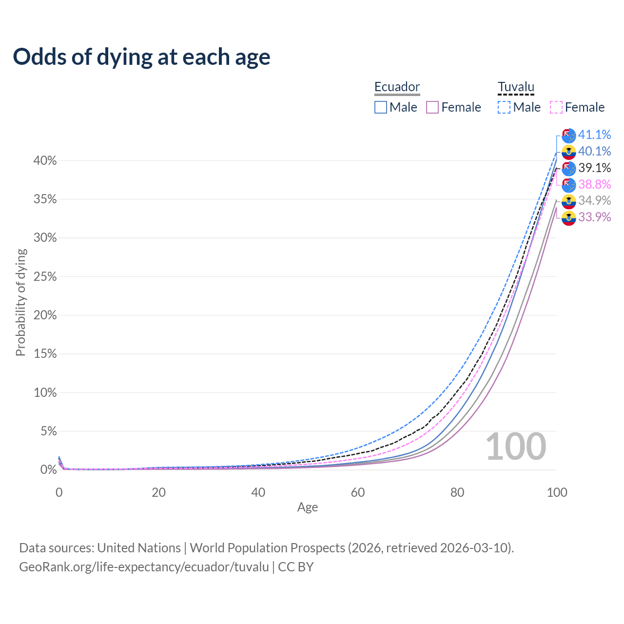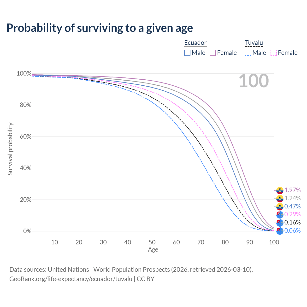 This life expectancy calculator shows the odds of living to 100, 95, 90, and below based on current age for both males and females in Ecuador and Tuvalu, along with mean and median age of death. The calculations are based on the 2026 life tables (actuarial tables) from the UN World Population Prospects.