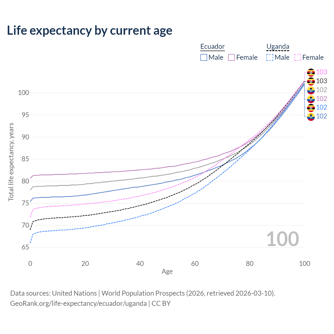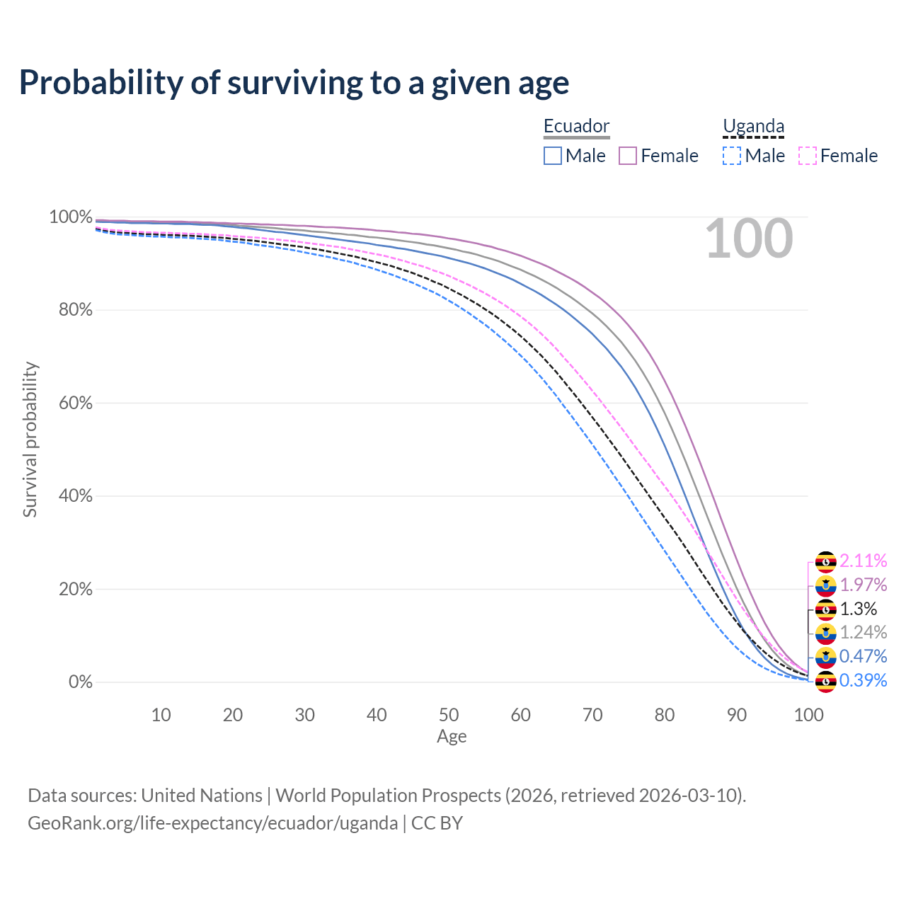 This life expectancy calculator shows the odds of living to 100, 95, 90, and below based on current age for both males and females in Ecuador and Uganda, along with mean and median age of death. The calculations are based on the 2026 life tables (actuarial tables) from the UN World Population Prospects.