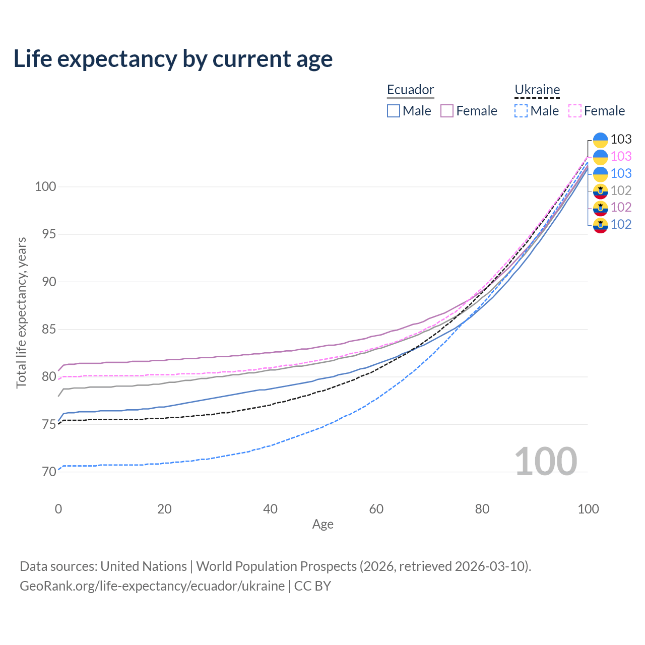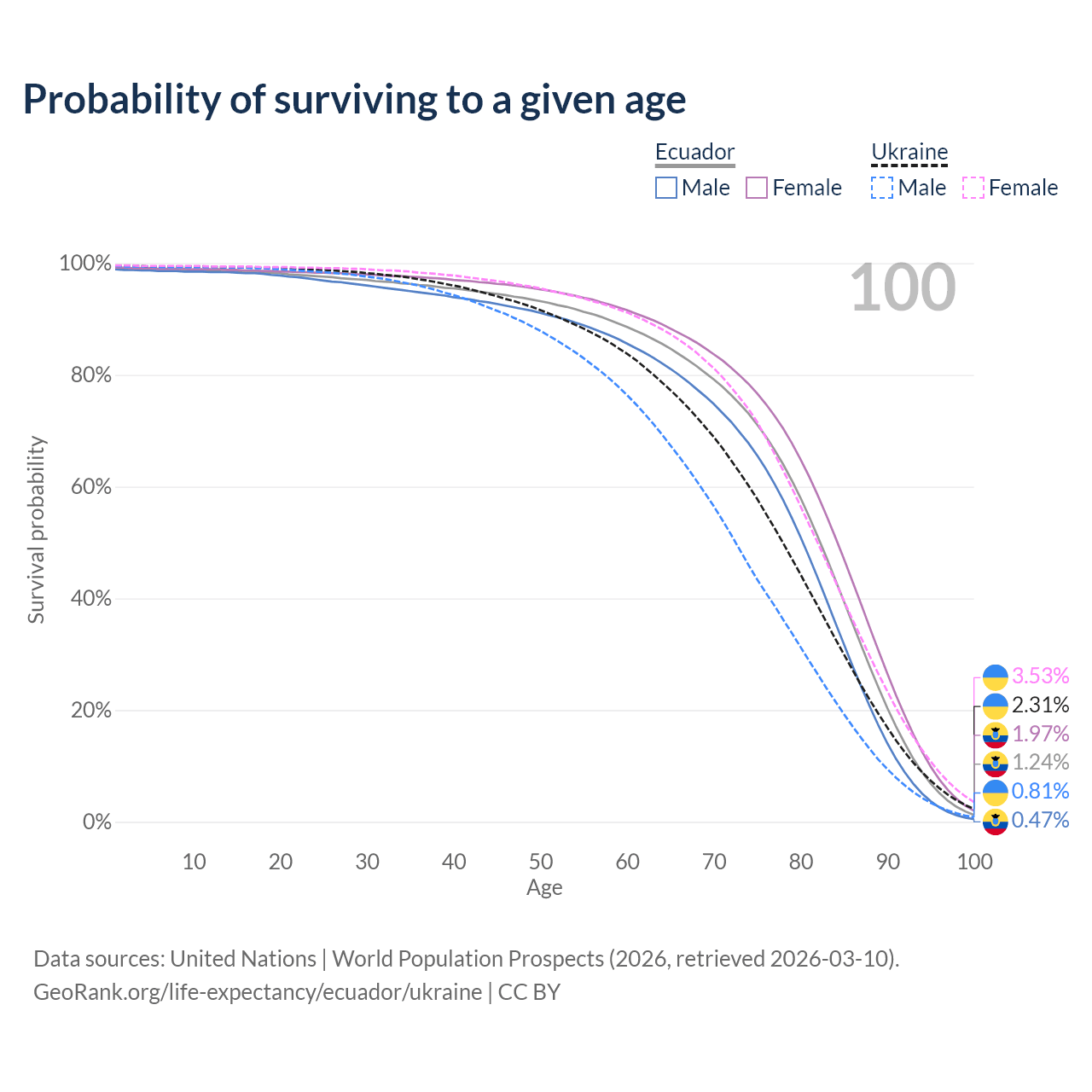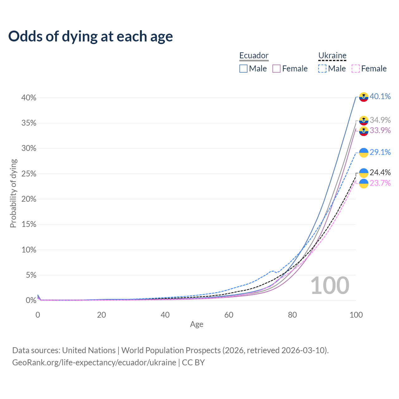 This life expectancy calculator shows the odds of living to 100, 95, 90, and below based on current age for both males and females in Ecuador and Ukraine, along with mean and median age of death. The calculations are based on the 2026 life tables (actuarial tables) from the UN World Population Prospects.