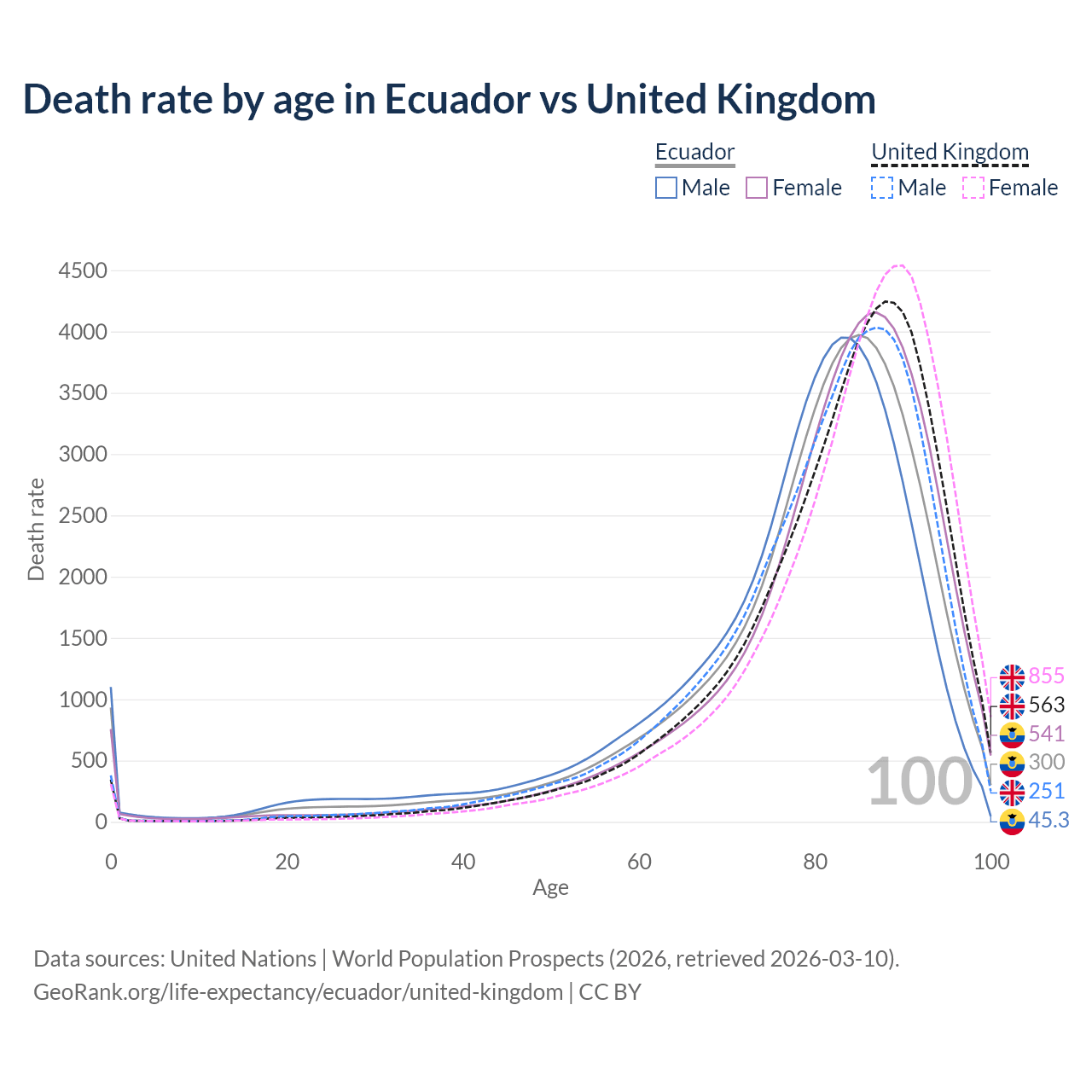 This life expectancy calculator shows the odds of living to 100, 95, 90, and below based on current age for both males and females in Ecuador and the United Kingdom, along with mean and median age of death. The calculations are based on the 2026 life tables (actuarial tables) from the UN World Population Prospects.