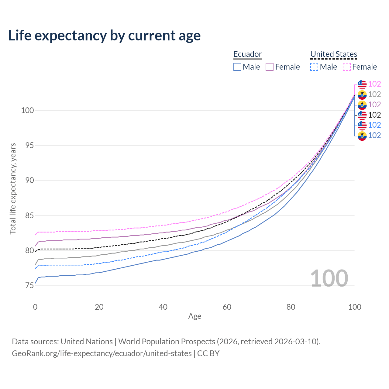 This life expectancy calculator shows the odds of living to 100, 95, 90, and below based on current age for both males and females in Ecuador and the United States, along with mean and median age of death. The calculations are based on the 2026 life tables (actuarial tables) from the UN World Population Prospects.