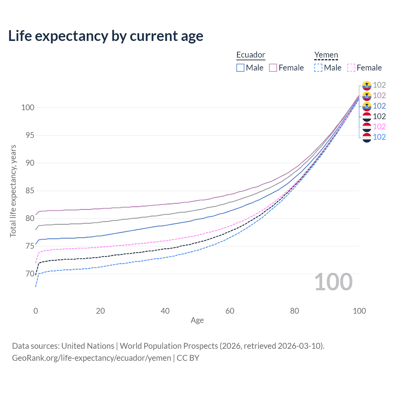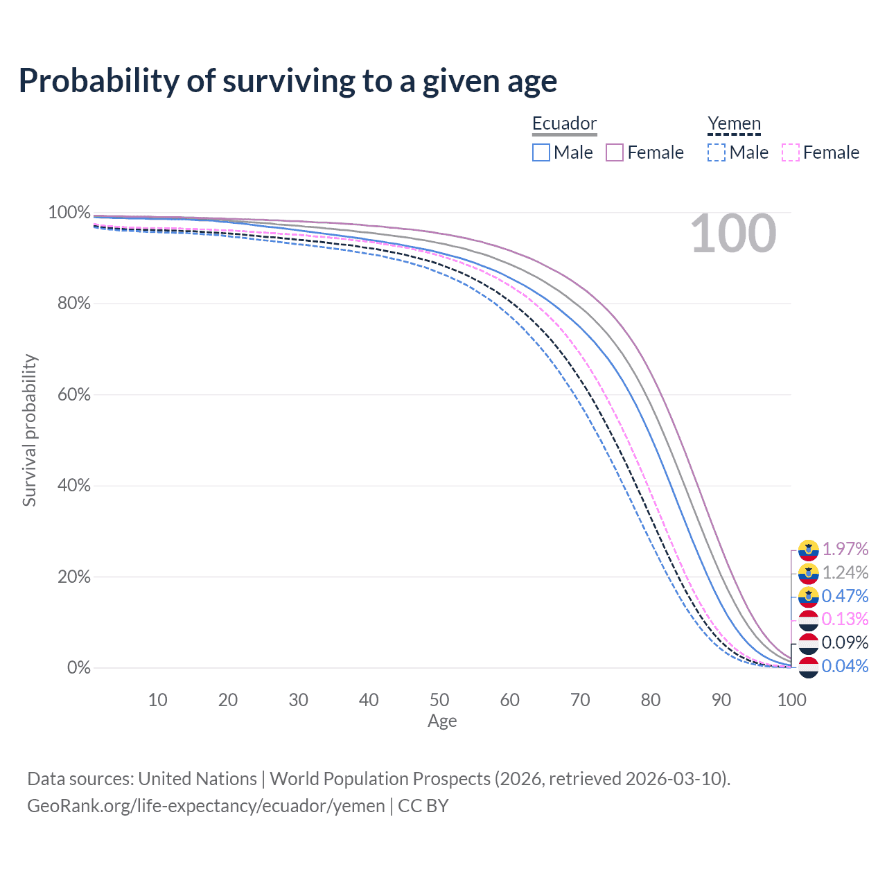 This life expectancy calculator shows the odds of living to 100, 95, 90, and below based on current age for both males and females in Ecuador and Yemen, along with mean and median age of death. The calculations are based on the 2026 life tables (actuarial tables) from the UN World Population Prospects.