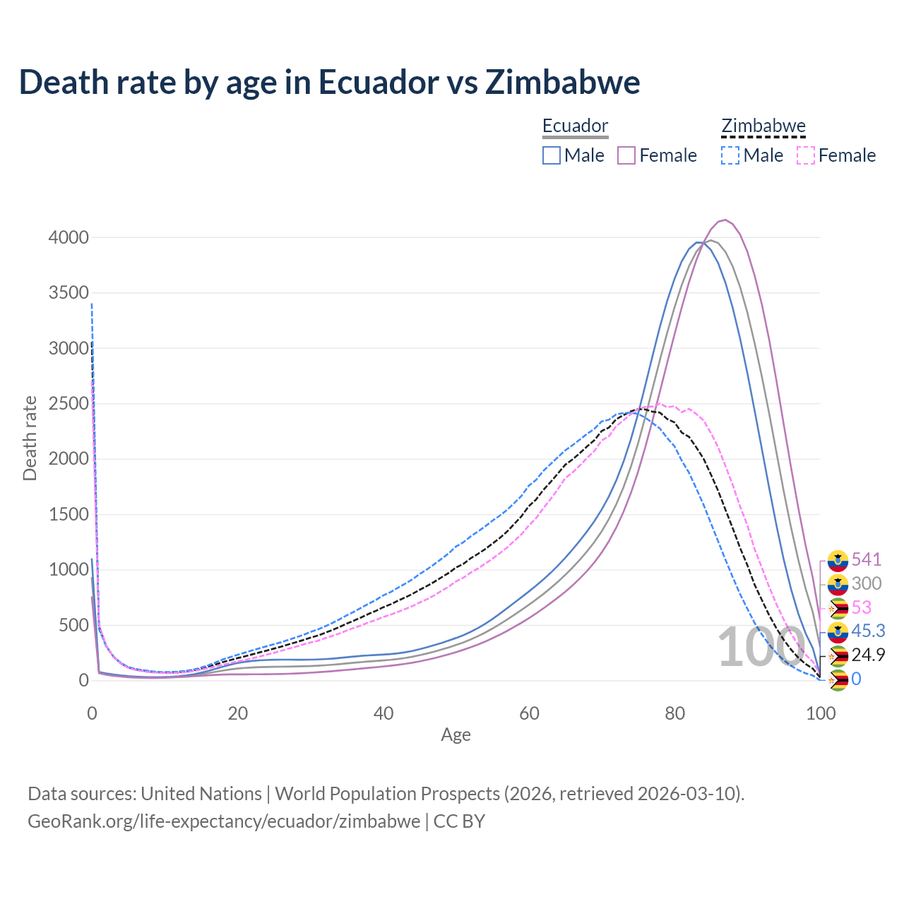 In Ecuador, the most common age of death is 85, compared to 0 in Zimbabwe. The median age of death is 82.3 in Ecuador and 68.8 in Zimbabwe, meaning only half of each cohort is expected to live past that age.