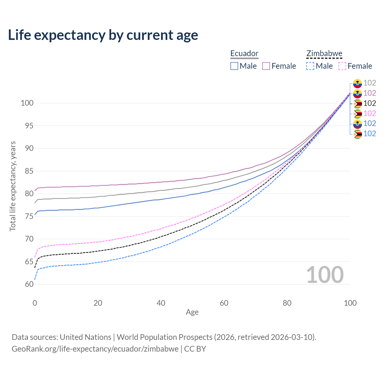 This life expectancy calculator shows the odds of living to 100, 95, 90, and below based on current age for both males and females in Ecuador and Zimbabwe, along with mean and median age of death. The calculations are based on the 2026 life tables (actuarial tables) from the UN World Population Prospects.