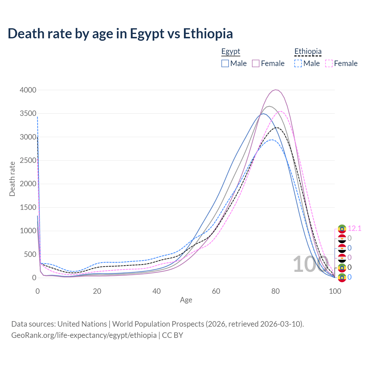 In Egypt, the most common age of death is 78, compared to 80 in Ethiopia. The median age of death is 75.2 in Egypt and 74.8 in Ethiopia, meaning only half of each cohort is expected to live past that age.