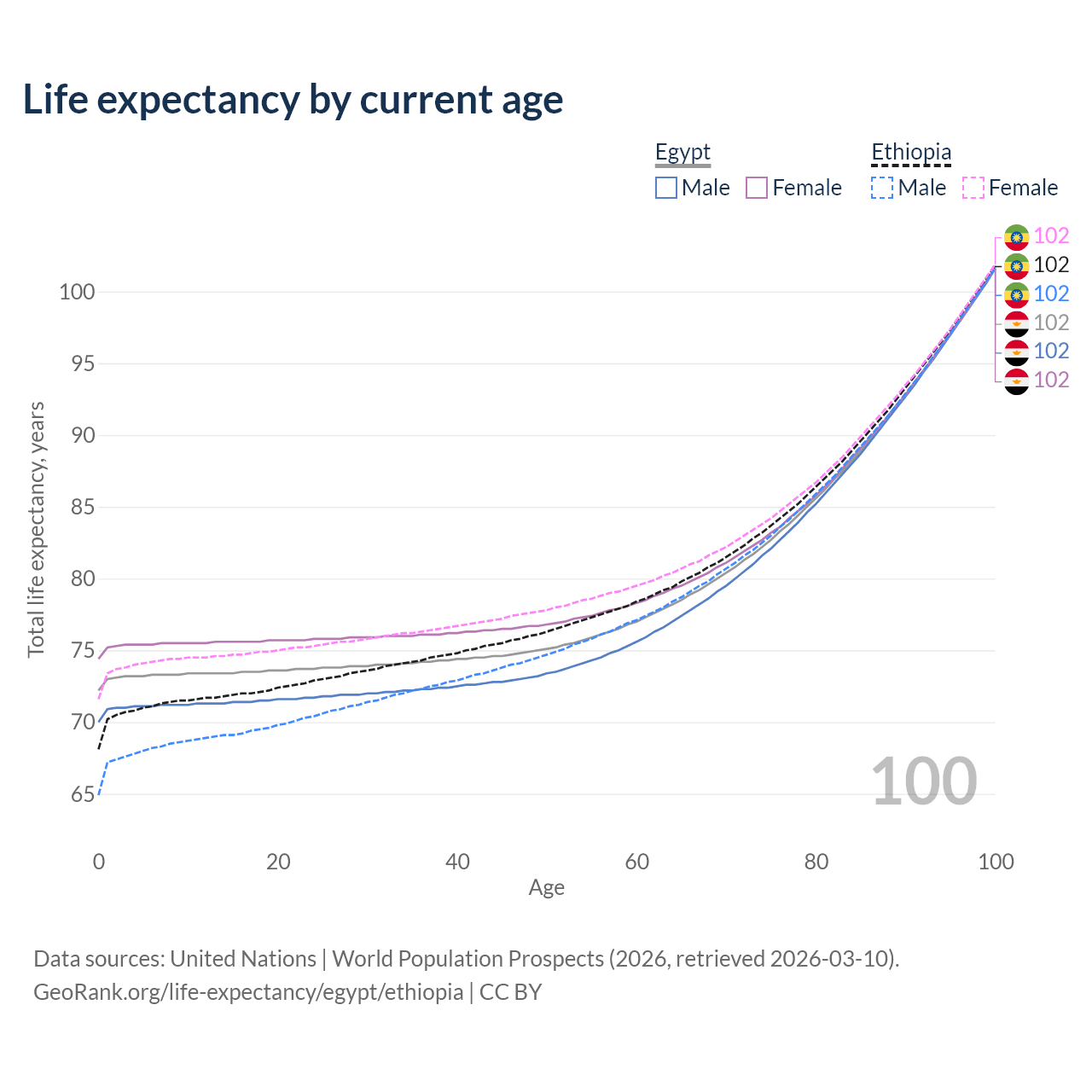 This life expectancy calculator shows the odds of living to 100, 95, 90, and below based on current age for both males and females in Egypt and Ethiopia, along with mean and median age of death. The calculations are based on the 2026 life tables (actuarial tables) from the UN World Population Prospects.