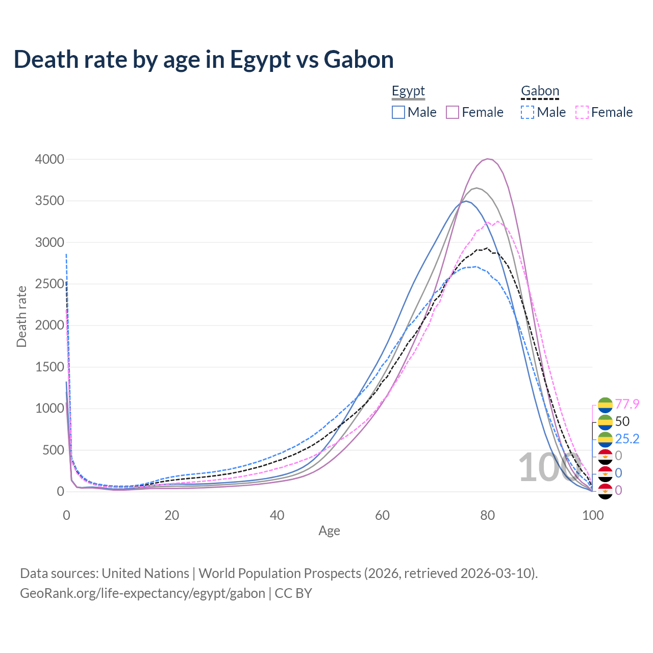 In Egypt, the most common age of death is 78, compared to 80 in Gabon. The median age of death is 75.2 in Egypt and 73.9 in Gabon, meaning only half of each cohort is expected to live past that age.