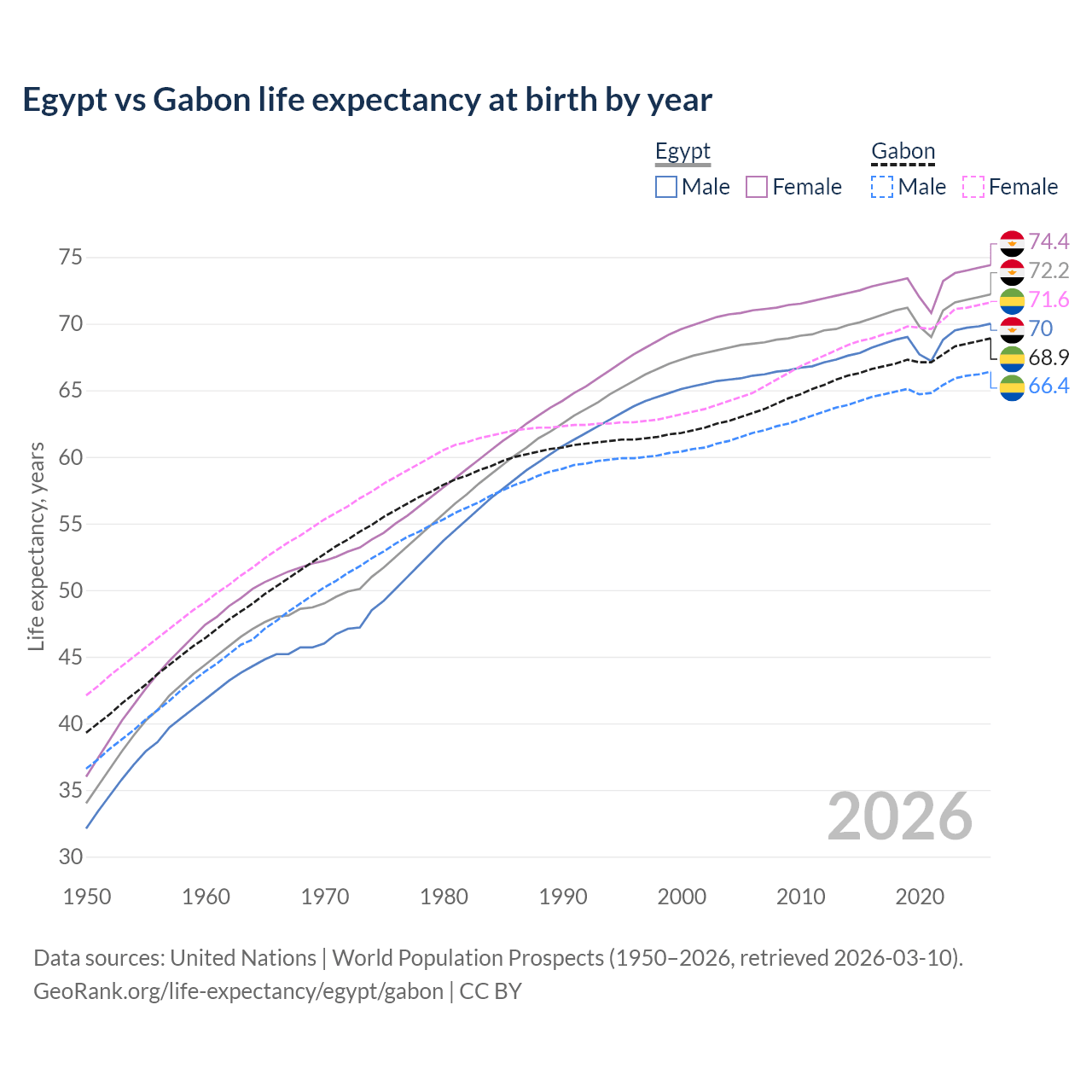 The average life expectancy at birth is 72.2 years in Egypt vs 68.9 in Gabon. Egypt is ranked 122/197 by life expectancy, and Gabon is 147/197. In Egypt, the life expectancy is 70 years for males and 74.4 years for females. In Gabon, it's 66.4 years for males and 71.6 years for females.