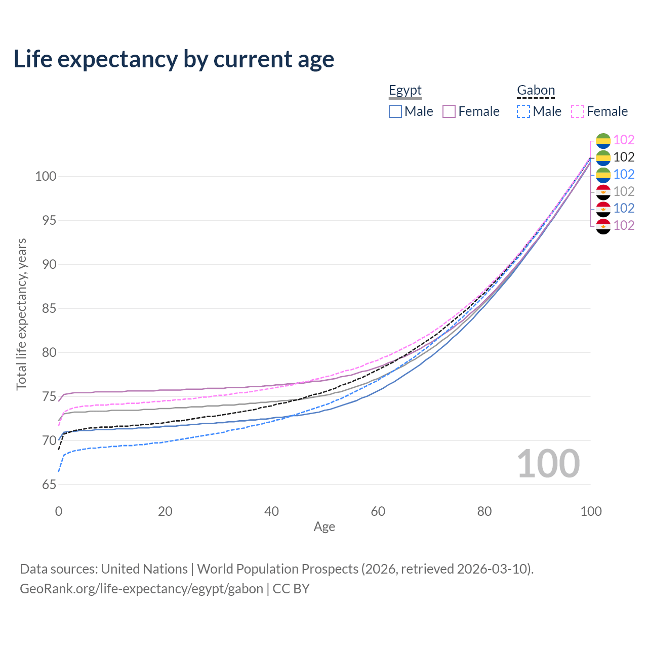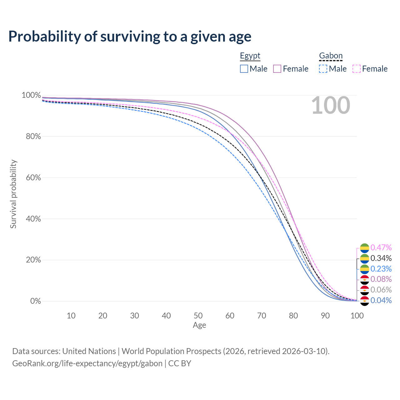 This life expectancy calculator shows the odds of living to 100, 95, 90, and below based on current age for both males and females in Egypt and Gabon, along with mean and median age of death. The calculations are based on the 2026 life tables (actuarial tables) from the UN World Population Prospects.
