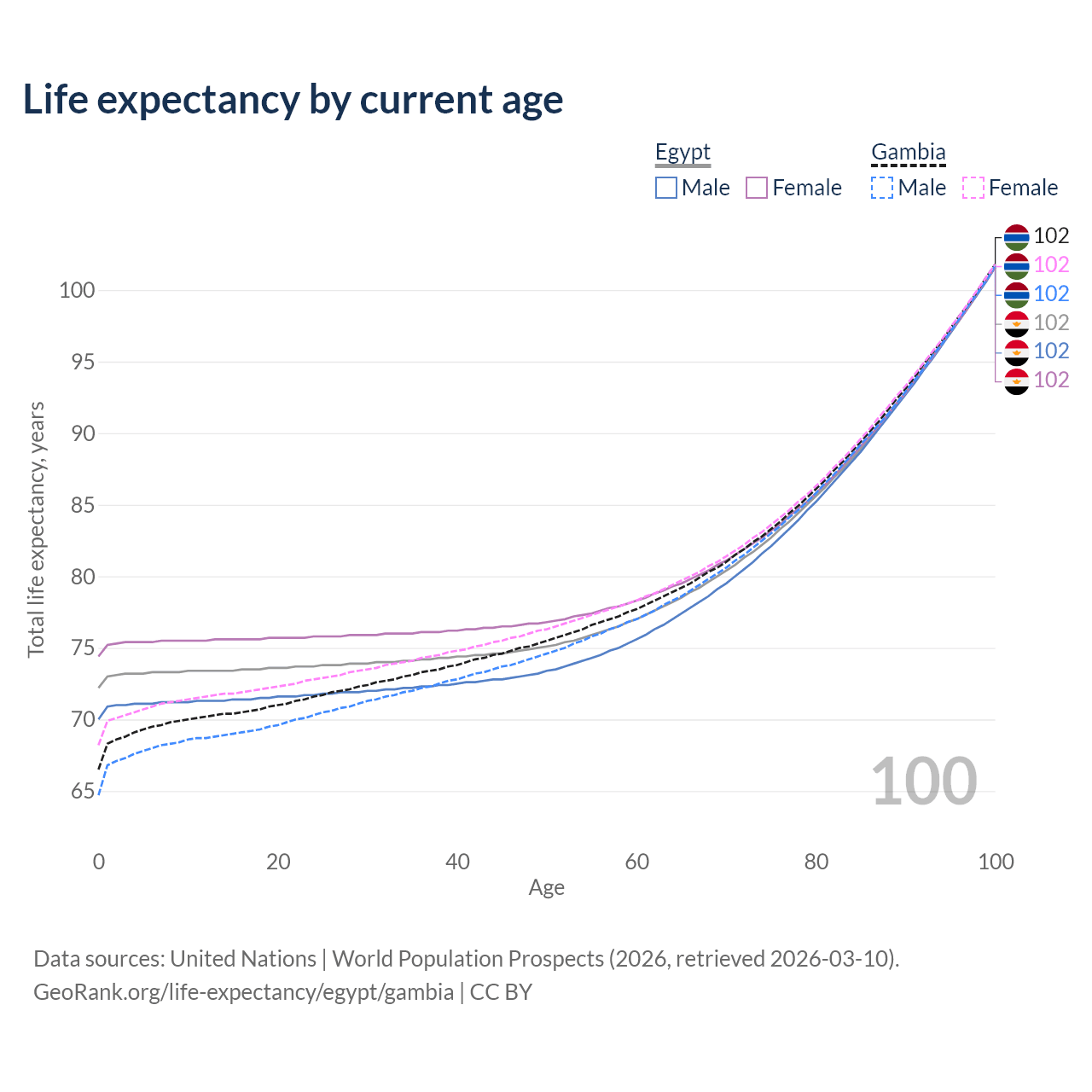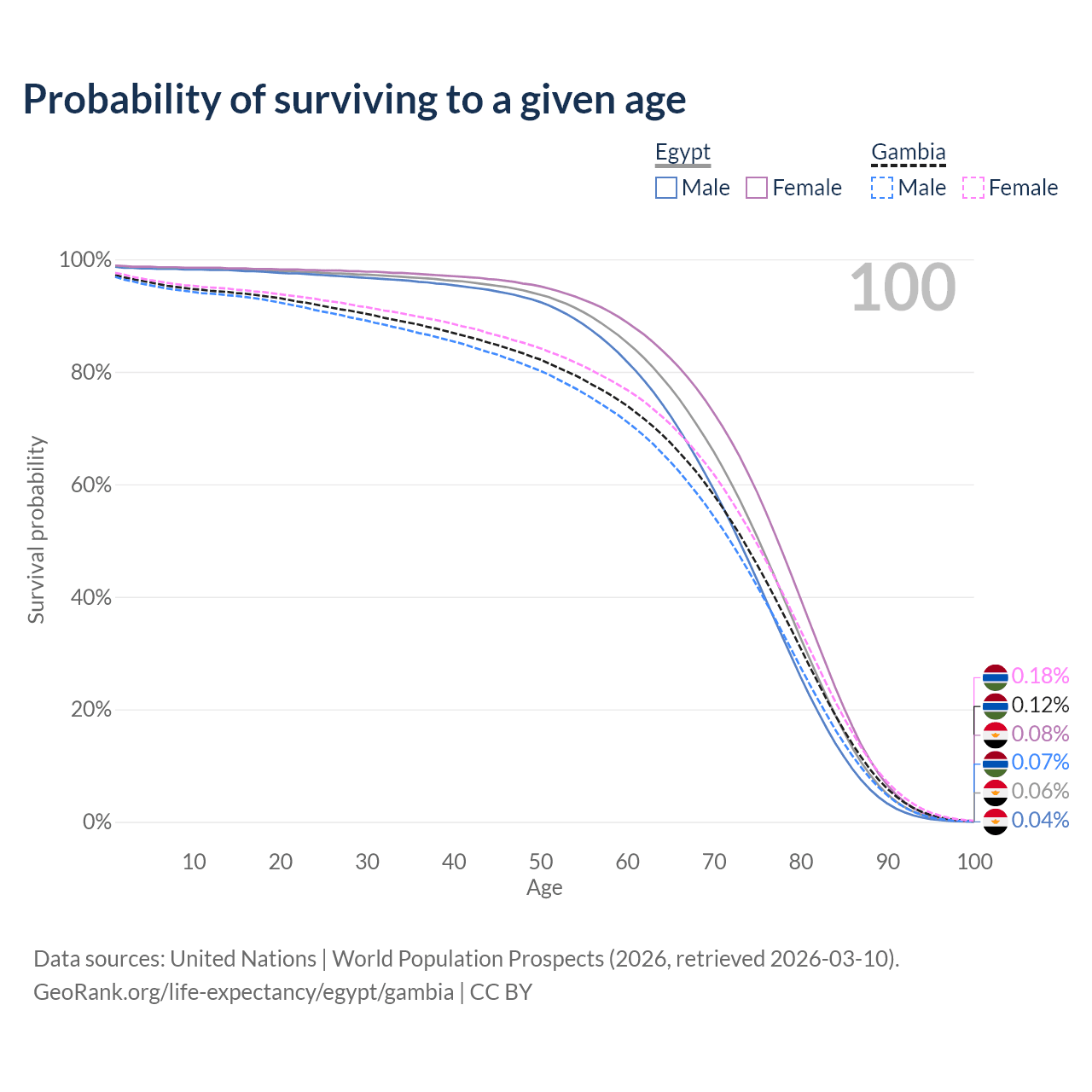 This life expectancy calculator shows the odds of living to 100, 95, 90, and below based on current age for both males and females in Egypt and the Gambia, along with mean and median age of death. The calculations are based on the 2026 life tables (actuarial tables) from the UN World Population Prospects.