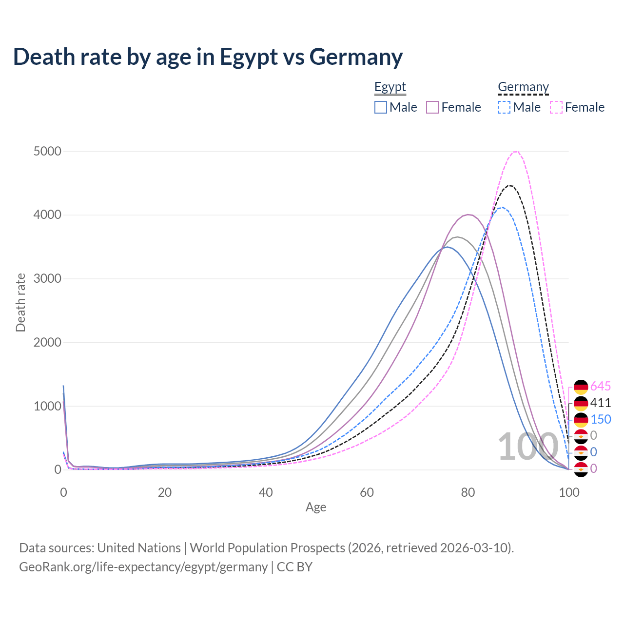 In Egypt, the most common age of death is 78, compared to 88 in Germany. The median age of death is 75.2 in Egypt and 85.1 in Germany, meaning only half of each cohort is expected to live past that age.