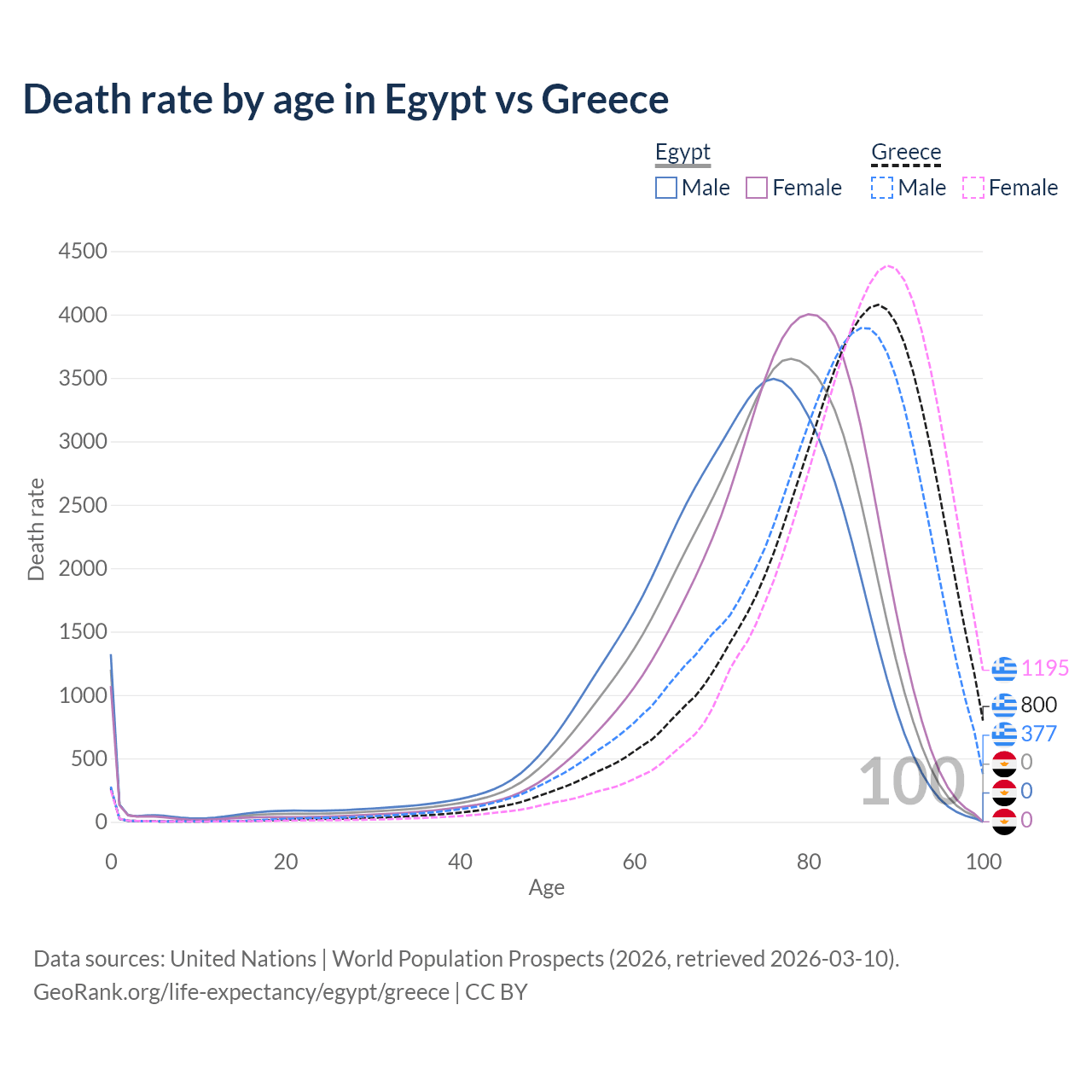 In Egypt, the most common age of death is 78, compared to 88 in Greece. The median age of death is 75.2 in Egypt and 84.9 in Greece, meaning only half of each cohort is expected to live past that age.