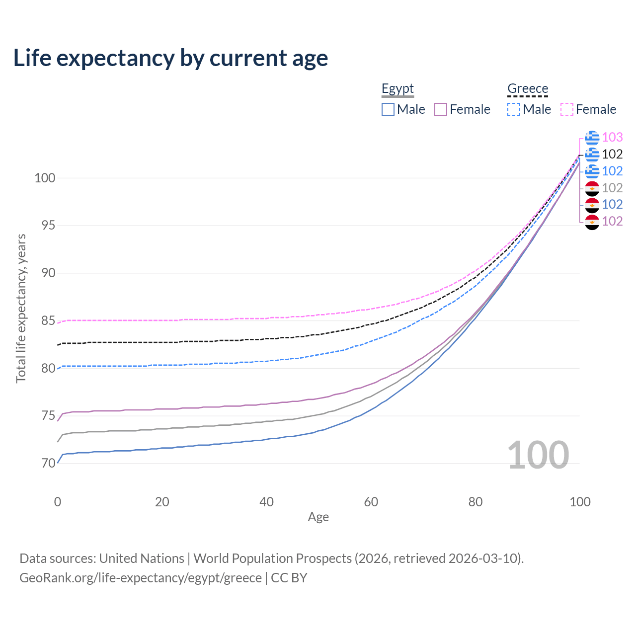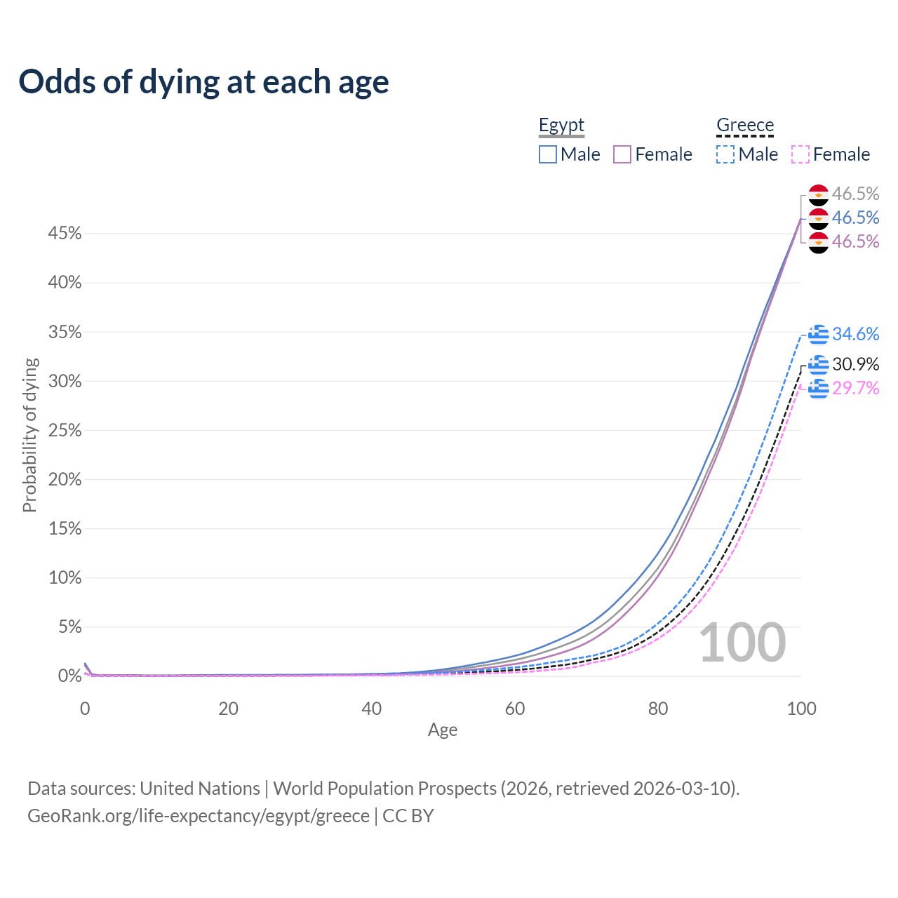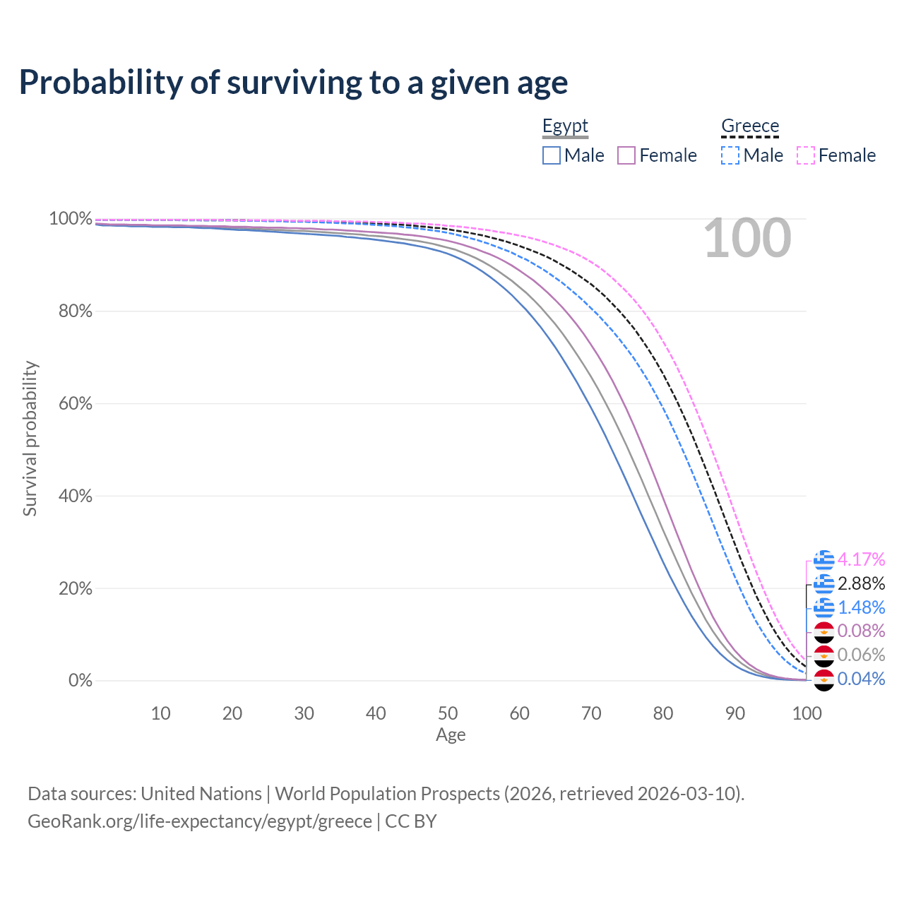 This life expectancy calculator shows the odds of living to 100, 95, 90, and below based on current age for both males and females in Egypt and Greece, along with mean and median age of death. The calculations are based on the 2026 life tables (actuarial tables) from the UN World Population Prospects.