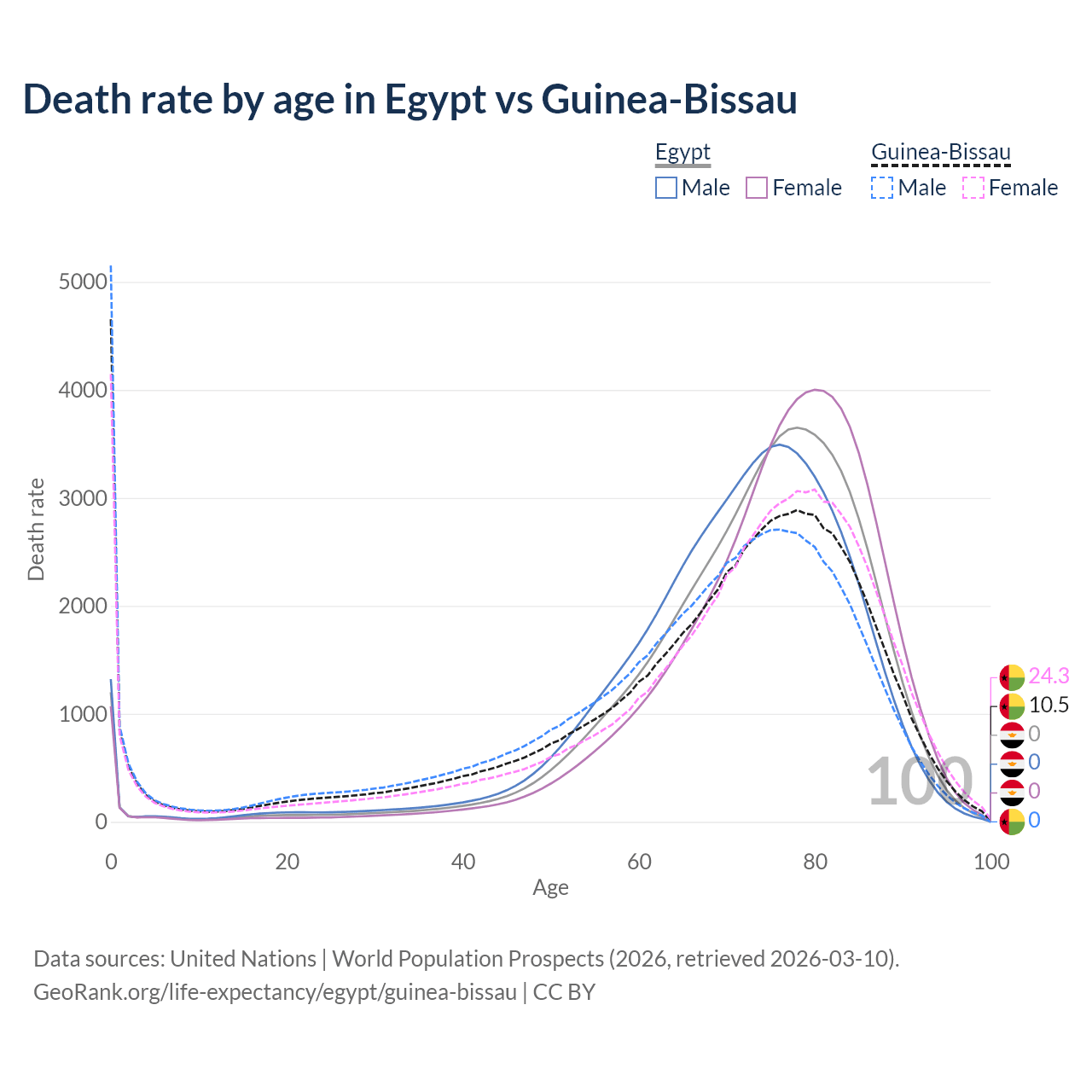 In Egypt, the most common age of death is 78, compared to 0 in Guinea-Bissau. The median age of death is 75.2 in Egypt and 71.8 in Guinea-Bissau, meaning only half of each cohort is expected to live past that age.