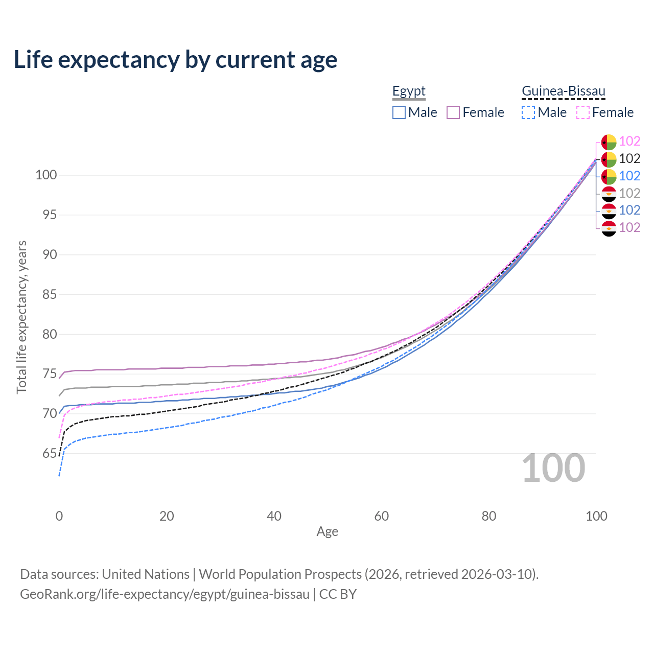 This life expectancy calculator shows the odds of living to 100, 95, 90, and below based on current age for both males and females in Egypt and Guinea-Bissau, along with mean and median age of death. The calculations are based on the 2026 life tables (actuarial tables) from the UN World Population Prospects.