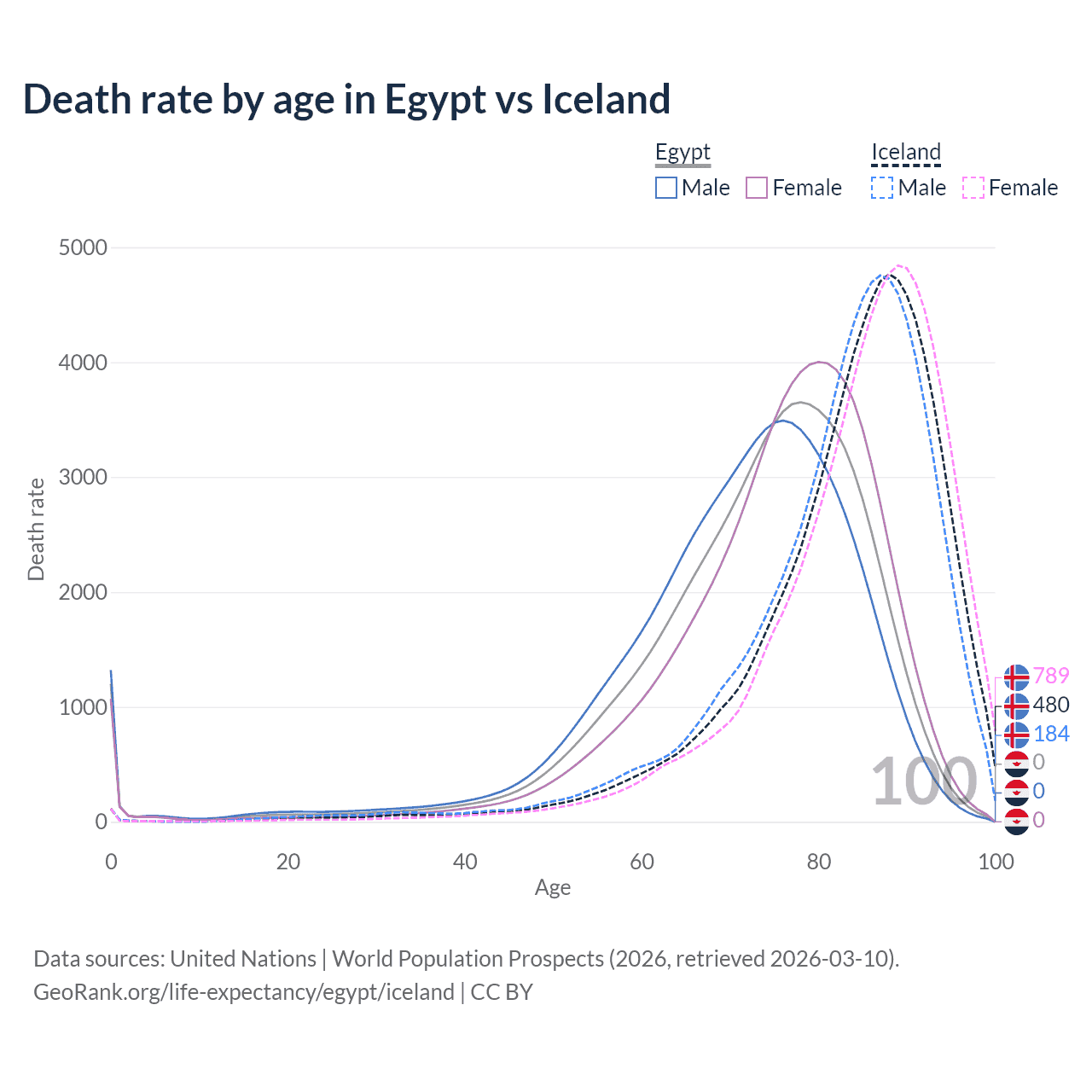 In Egypt, the most common age of death is 78, compared to 88 in Iceland. The median age of death is 75.2 in Egypt and 85.9 in Iceland, meaning only half of each cohort is expected to live past that age.