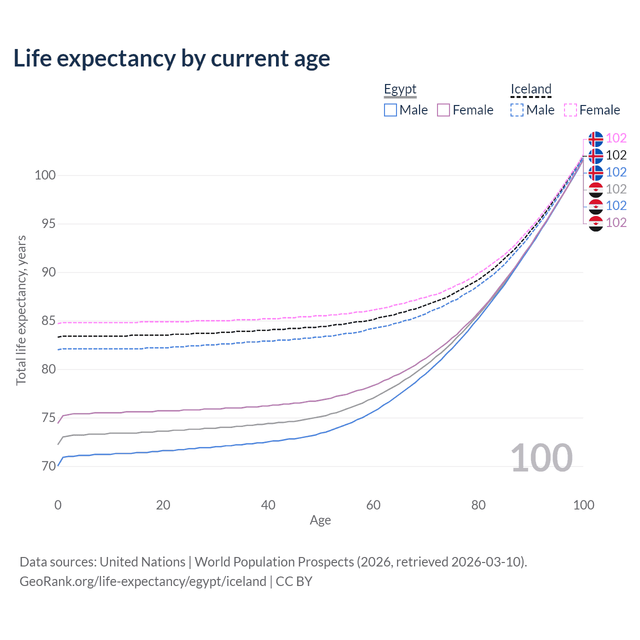 This life expectancy calculator shows the odds of living to 100, 95, 90, and below based on current age for both males and females in Egypt and Iceland, along with mean and median age of death. The calculations are based on the 2026 life tables (actuarial tables) from the UN World Population Prospects.
