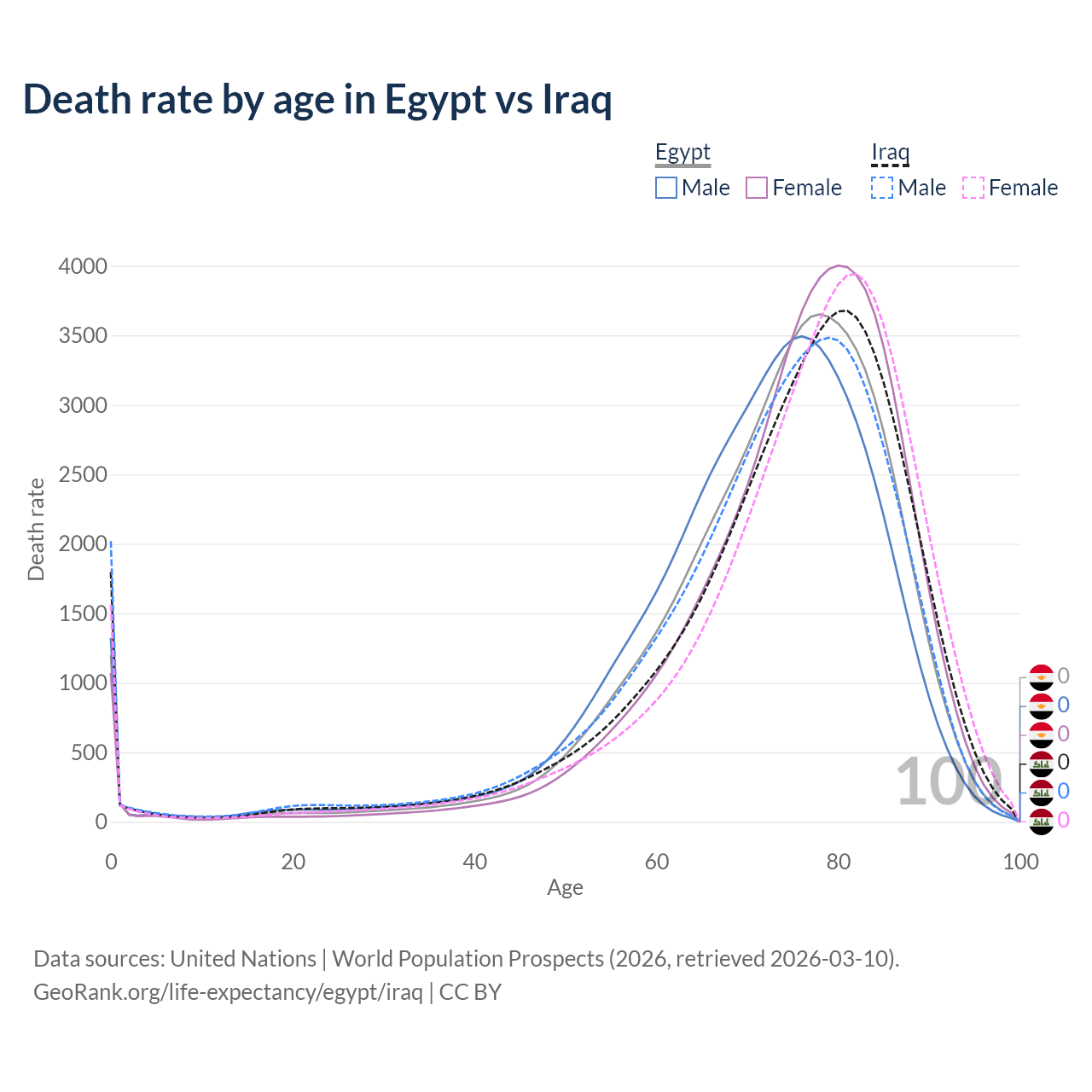 In Egypt, the most common age of death is 78, compared to 81 in Iraq. The median age of death is 75.2 in Egypt and 76.7 in Iraq, meaning only half of each cohort is expected to live past that age.