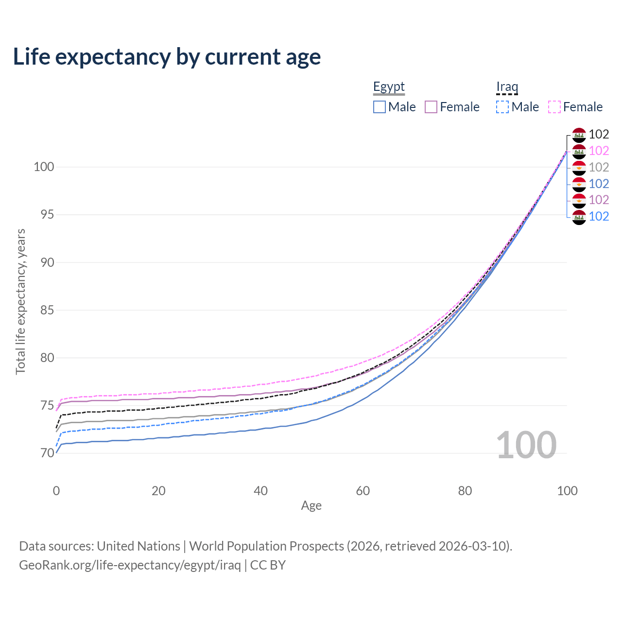 This life expectancy calculator shows the odds of living to 100, 95, 90, and below based on current age for both males and females in Egypt and Iraq, along with mean and median age of death. The calculations are based on the 2026 life tables (actuarial tables) from the UN World Population Prospects.