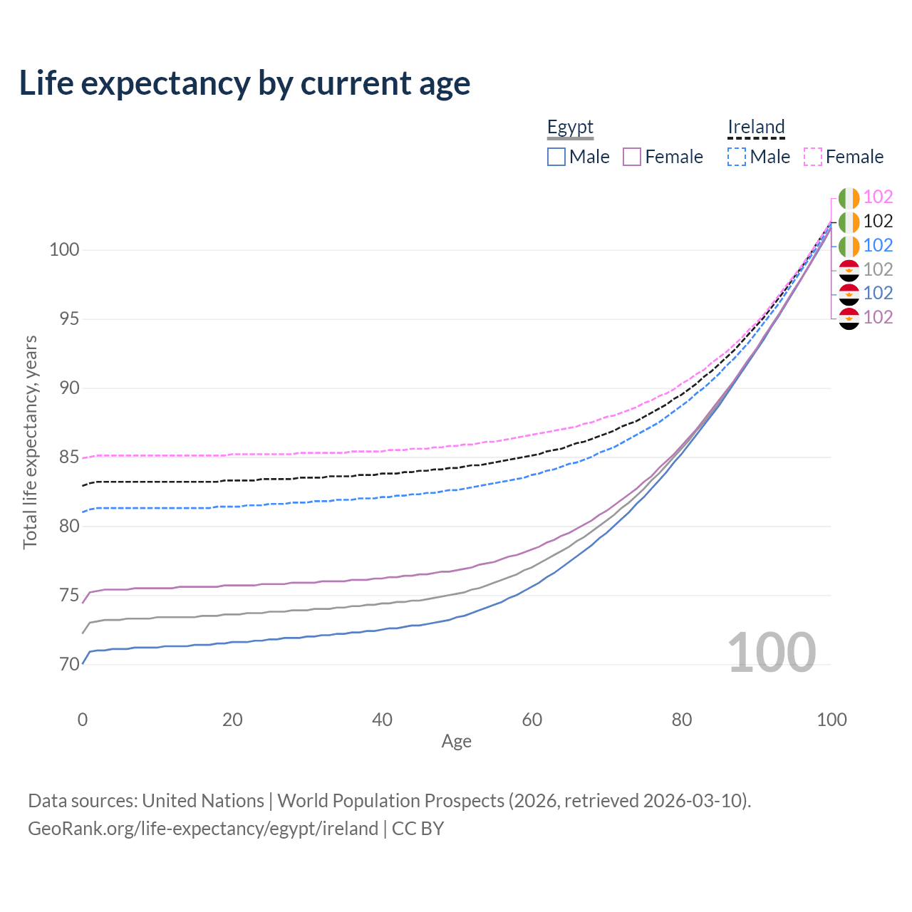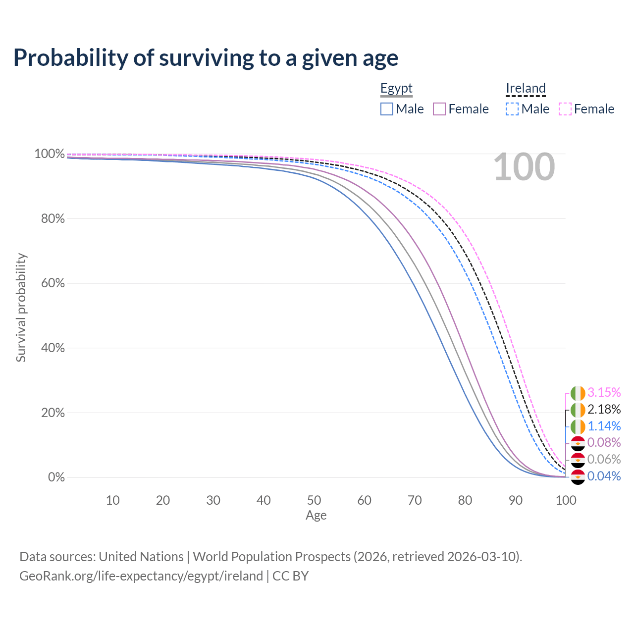 This life expectancy calculator shows the odds of living to 100, 95, 90, and below based on current age for both males and females in Egypt and Ireland, along with mean and median age of death. The calculations are based on the 2026 life tables (actuarial tables) from the UN World Population Prospects.