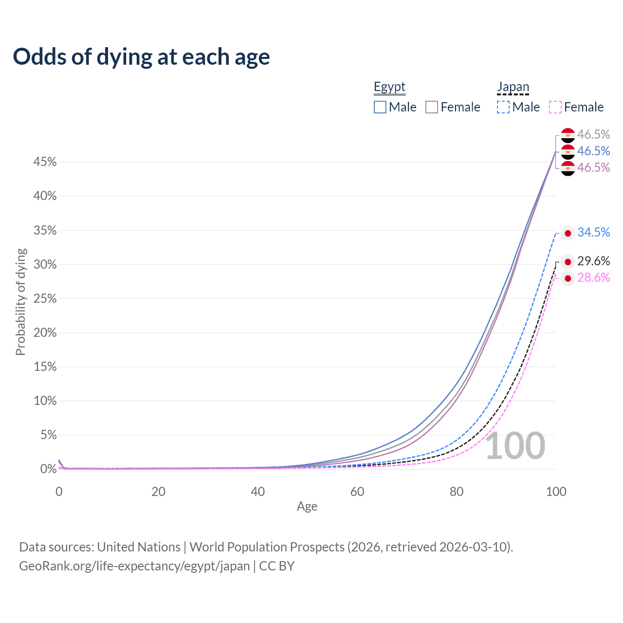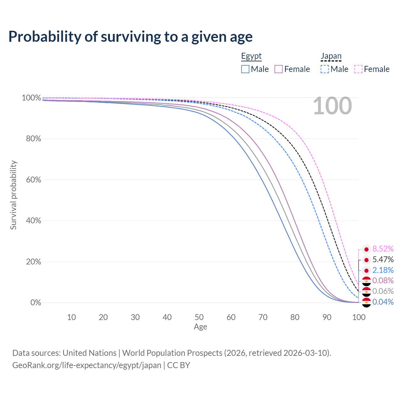 This life expectancy calculator shows the odds of living to 100, 95, 90, and below based on current age for both males and females in Egypt and Japan, along with mean and median age of death. The calculations are based on the 2026 life tables (actuarial tables) from the UN World Population Prospects.