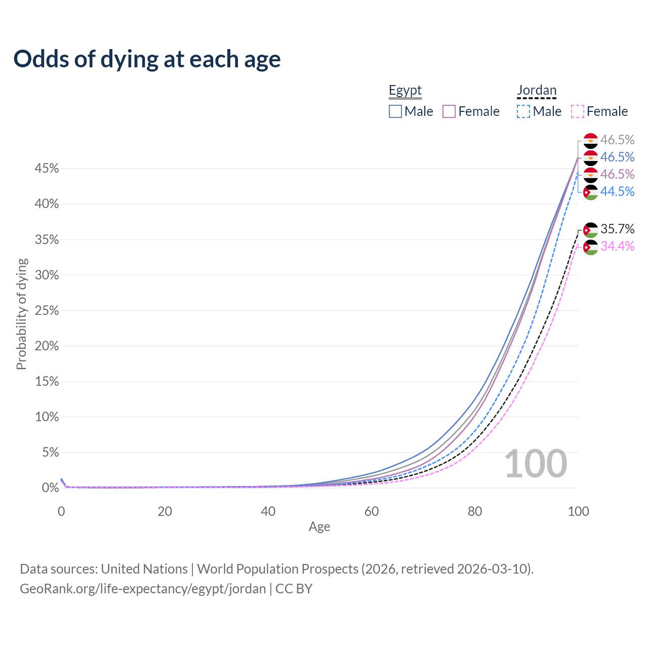 This life expectancy calculator shows the odds of living to 100, 95, 90, and below based on current age for both males and females in Egypt and Jordan, along with mean and median age of death. The calculations are based on the 2026 life tables (actuarial tables) from the UN World Population Prospects.