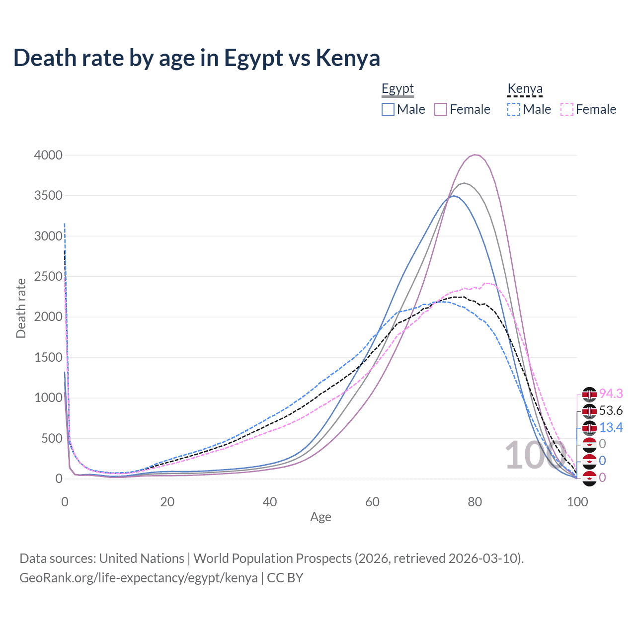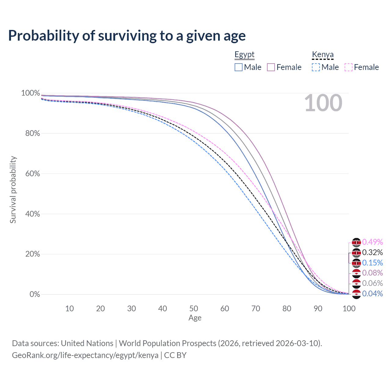 This life expectancy calculator shows the odds of living to 100, 95, 90, and below based on current age for both males and females in Egypt and Kenya, along with mean and median age of death. The calculations are based on the 2026 life tables (actuarial tables) from the UN World Population Prospects.