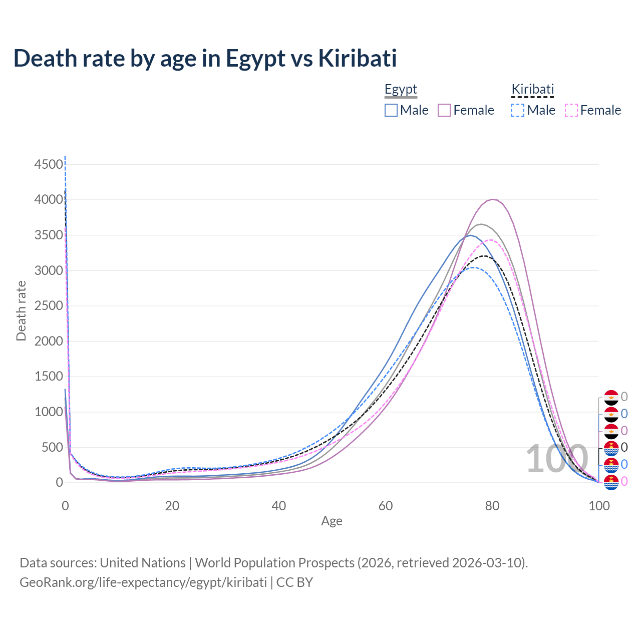 In Egypt, the most common age of death is 78, compared to 0 in Kiribati. The median age of death is 75.2 in Egypt and 73.1 in Kiribati, meaning only half of each cohort is expected to live past that age.