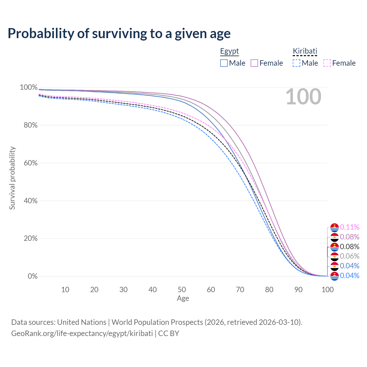This life expectancy calculator shows the odds of living to 100, 95, 90, and below based on current age for both males and females in Egypt and Kiribati, along with mean and median age of death. The calculations are based on the 2026 life tables (actuarial tables) from the UN World Population Prospects.