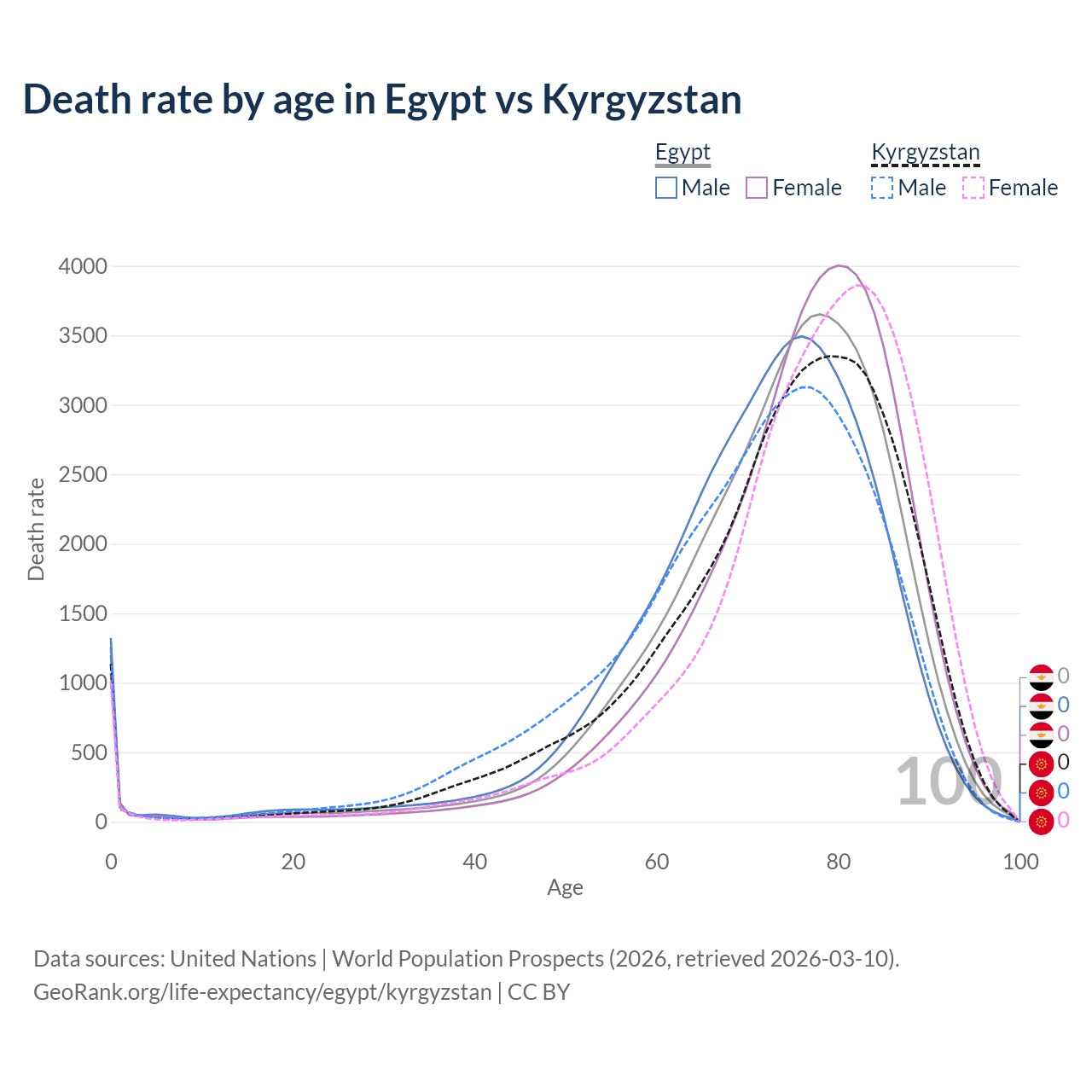 In Egypt, the most common age of death is 78, compared to 79 in Kyrgyzstan. The median age of death is 75.2 in Egypt and 75.6 in Kyrgyzstan, meaning only half of each cohort is expected to live past that age.