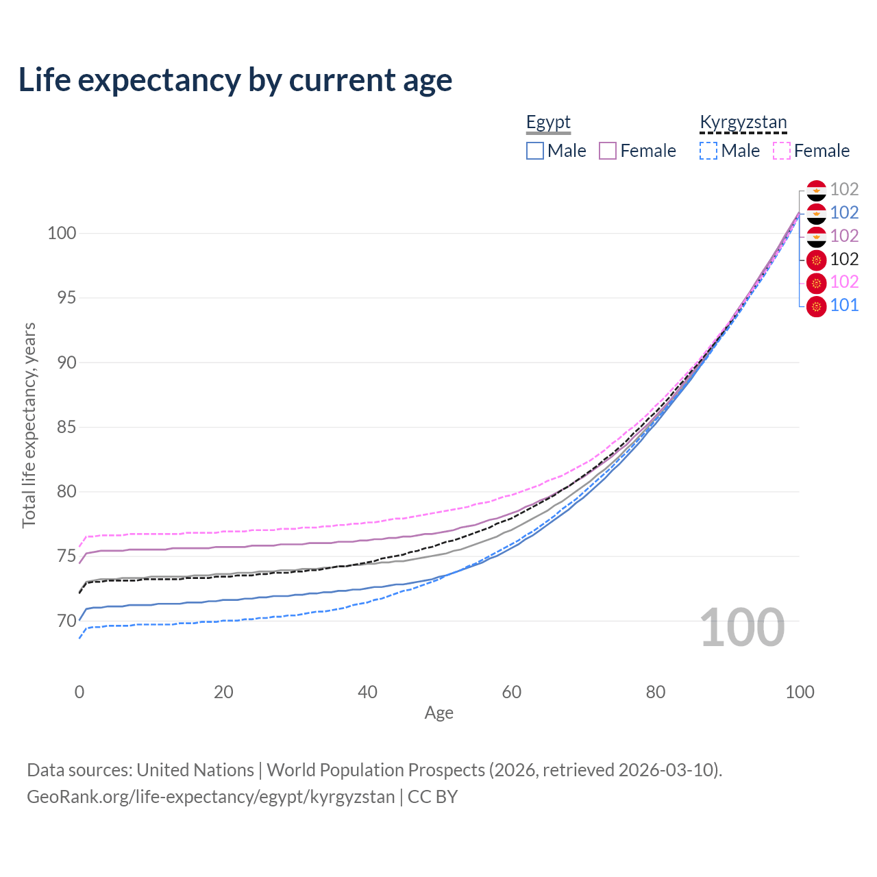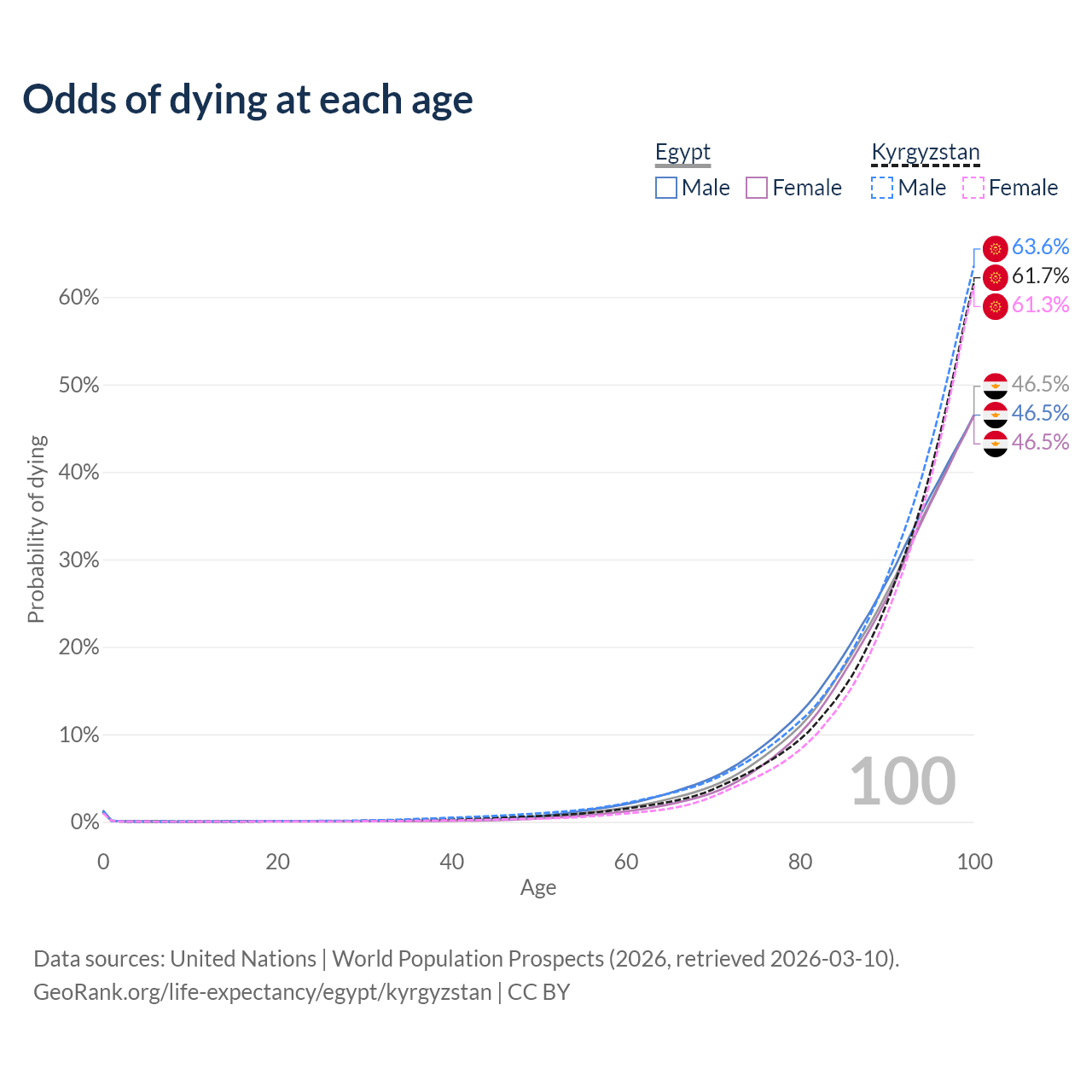 This life expectancy calculator shows the odds of living to 100, 95, 90, and below based on current age for both males and females in Egypt and Kyrgyzstan, along with mean and median age of death. The calculations are based on the 2026 life tables (actuarial tables) from the UN World Population Prospects.
