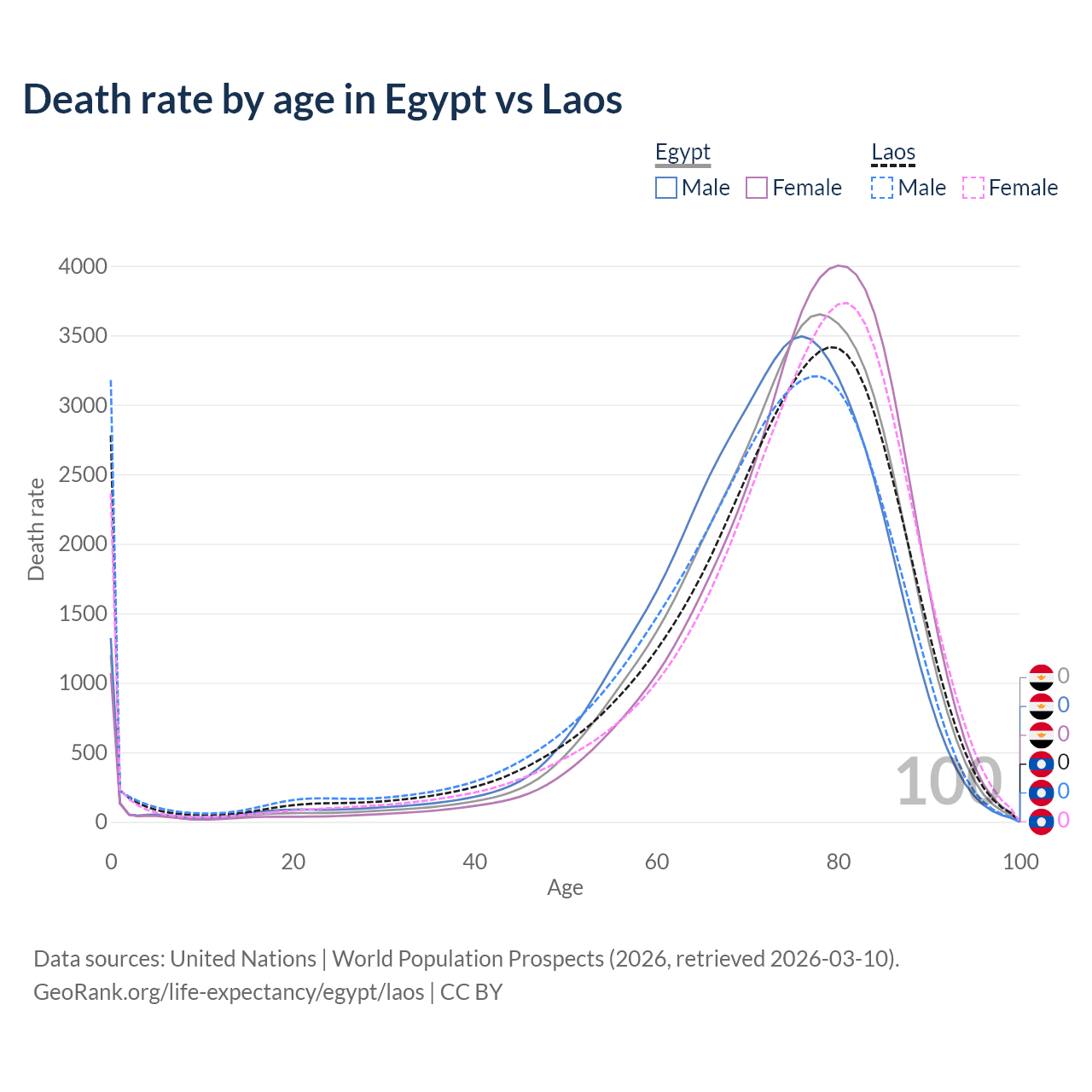 In Egypt, the most common age of death is 78, compared to 79 in Laos. The median age of death is 75.2 in Egypt and 74.7 in Laos, meaning only half of each cohort is expected to live past that age.