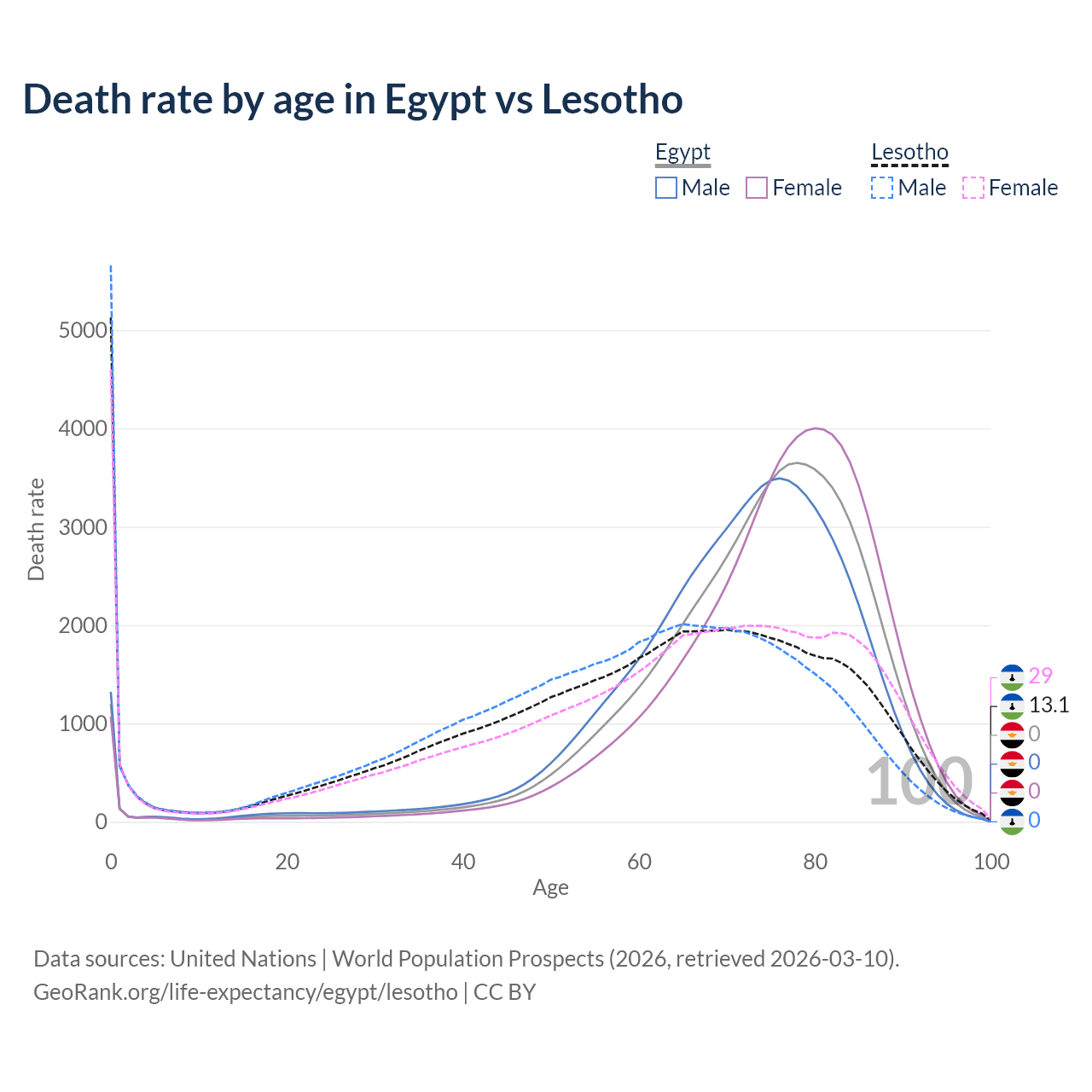 In Egypt, the most common age of death is 78, compared to 0 in Lesotho. The median age of death is 75.2 in Egypt and 63.4 in Lesotho, meaning only half of each cohort is expected to live past that age.