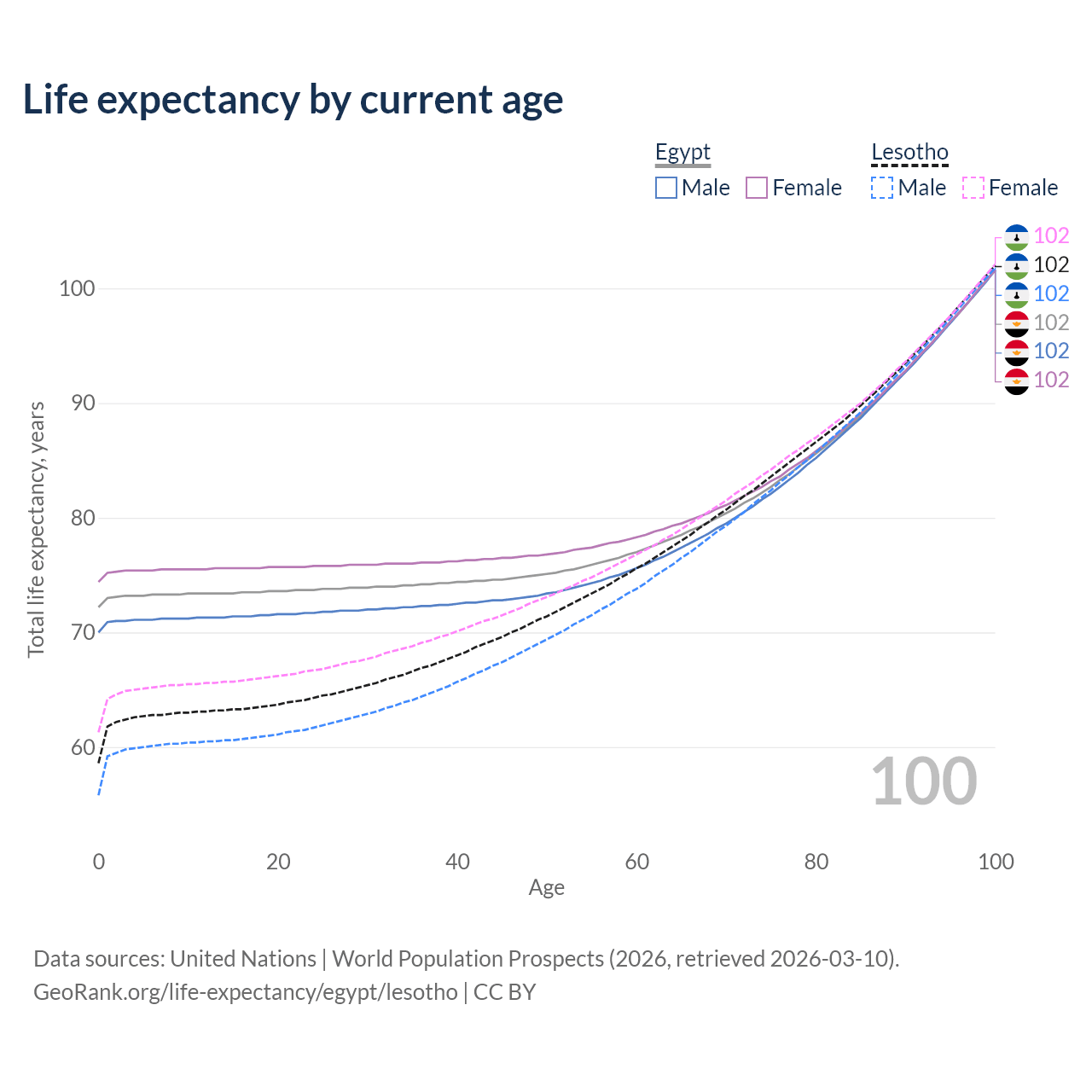 This life expectancy calculator shows the odds of living to 100, 95, 90, and below based on current age for both males and females in Egypt and Lesotho, along with mean and median age of death. The calculations are based on the 2026 life tables (actuarial tables) from the UN World Population Prospects.