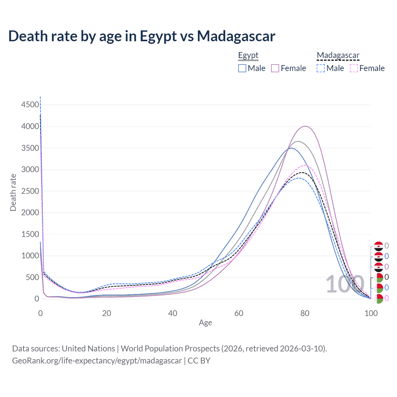 In Egypt, the most common age of death is 78, compared to 0 in Madagascar. The median age of death is 75.2 in Egypt and 72.2 in Madagascar, meaning only half of each cohort is expected to live past that age.