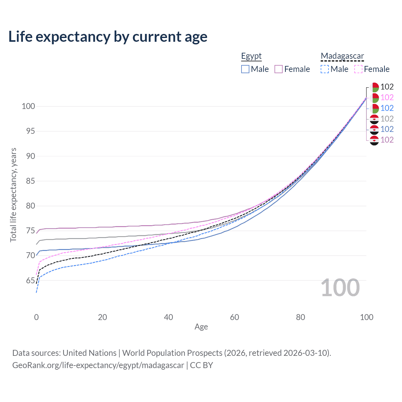 This life expectancy calculator shows the odds of living to 100, 95, 90, and below based on current age for both males and females in Egypt and Madagascar, along with mean and median age of death. The calculations are based on the 2026 life tables (actuarial tables) from the UN World Population Prospects.