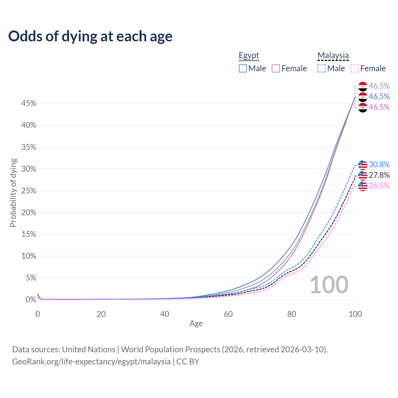 This life expectancy calculator shows the odds of living to 100, 95, 90, and below based on current age for both males and females in Egypt and Malaysia, along with mean and median age of death. The calculations are based on the 2026 life tables (actuarial tables) from the UN World Population Prospects.