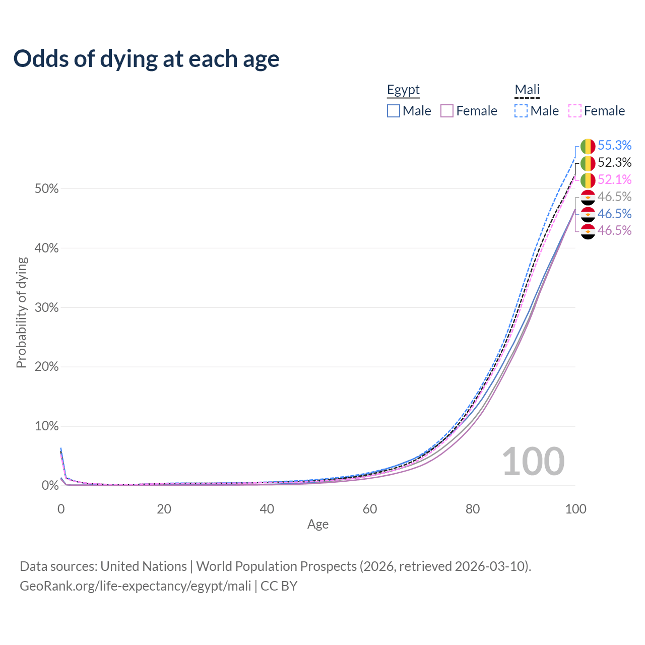 This life expectancy calculator shows the odds of living to 100, 95, 90, and below based on current age for both males and females in Egypt and Mali, along with mean and median age of death. The calculations are based on the 2026 life tables (actuarial tables) from the UN World Population Prospects.