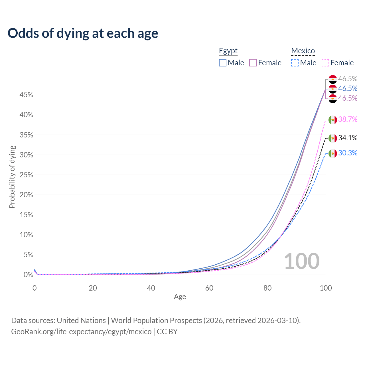 This life expectancy calculator shows the odds of living to 100, 95, 90, and below based on current age for both males and females in Egypt and Mexico, along with mean and median age of death. The calculations are based on the 2026 life tables (actuarial tables) from the UN World Population Prospects.