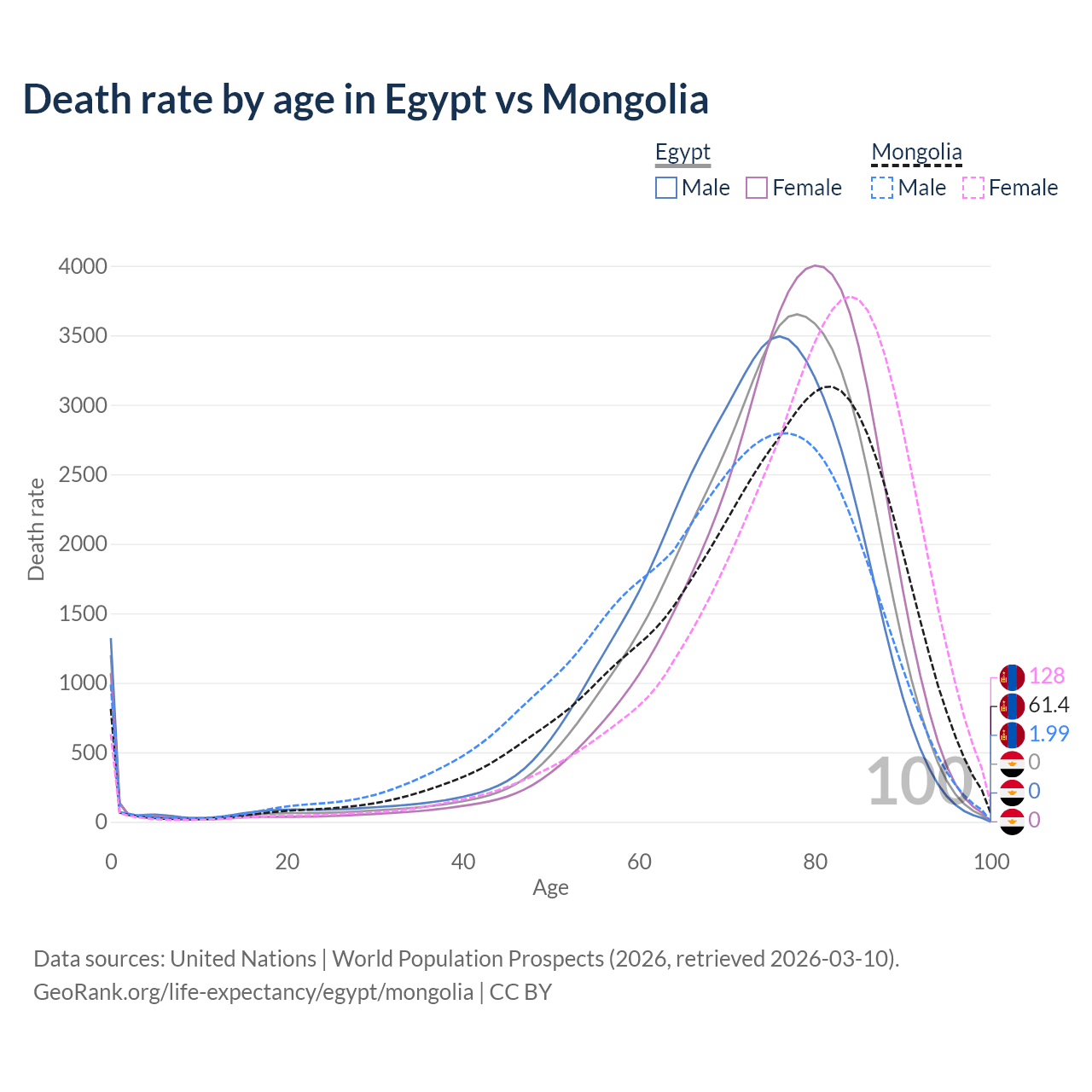 In Egypt, the most common age of death is 78, compared to 82 in Mongolia. The median age of death is 75.2 in Egypt and 76 in Mongolia, meaning only half of each cohort is expected to live past that age.